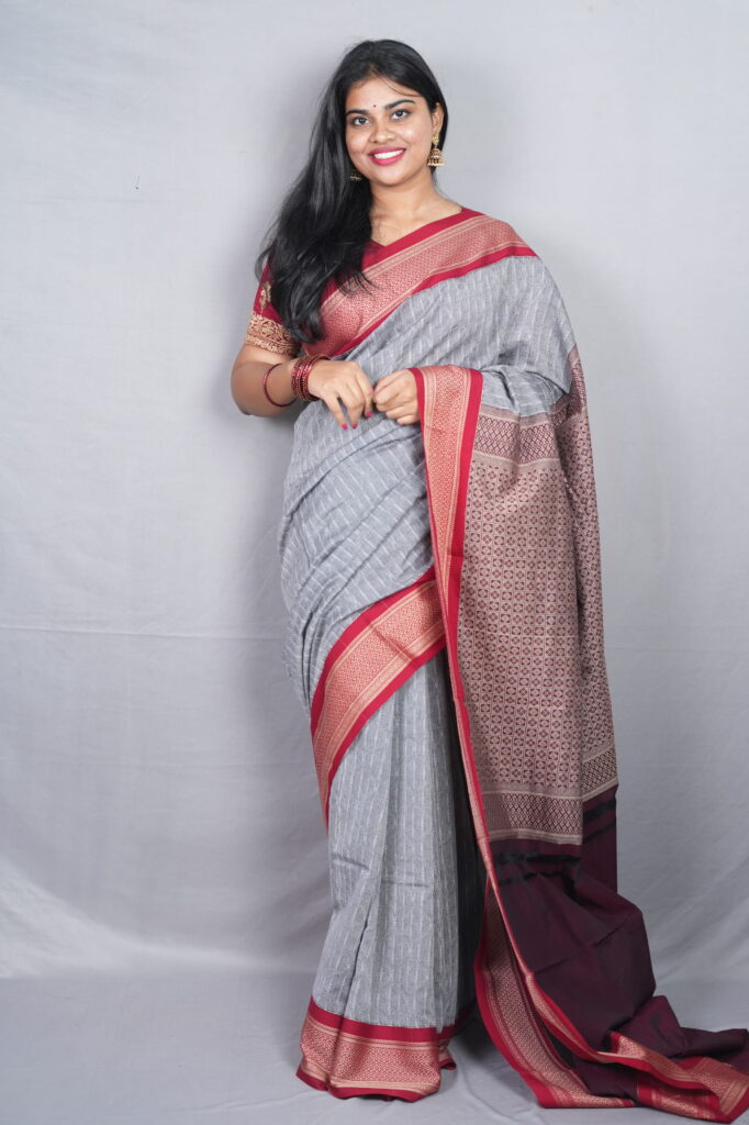 A sophisticated dialogue between modern neutrals and traditional jewel tones, this Mysore Kadiyal Cotton saree features a cool Steel Grey body with a soft, heathered texture. Framed by a sharp, Kadiyal-woven Maroon-Wine border and an intricate antique zari pallu, it offers a “refined professional” look that is breathable, structured, and timelessly elegant.