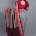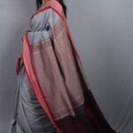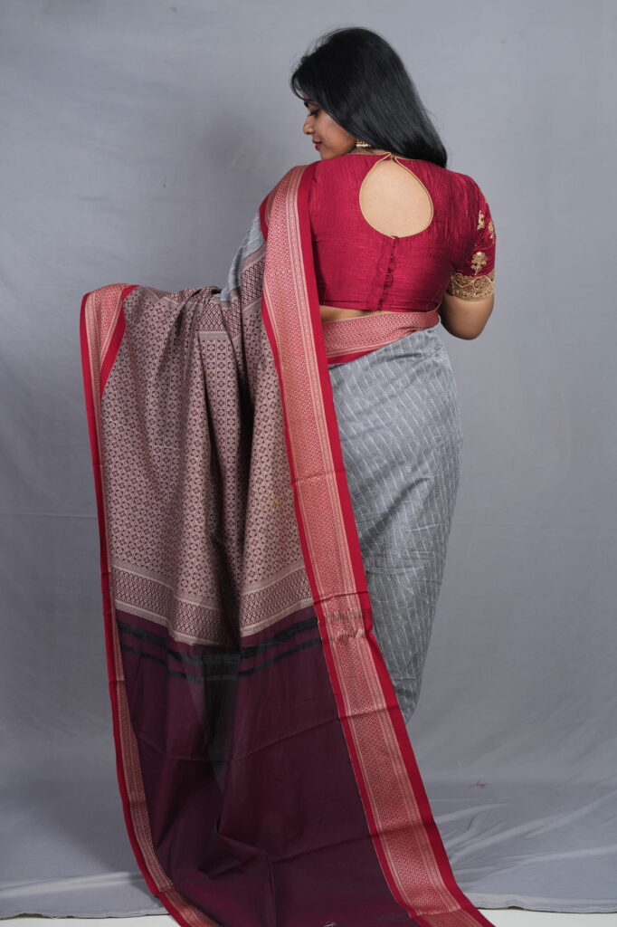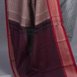 The Border: Ancient Kadiyal Precision The standout feature is the traditional Kadiyal weave, an ancient technique used to create a solid, sharp color-block between the grey body and the wine border. This border is adorned with intricate antique gold zari, featuring geometric patterns and traditional floral motifs that provide a subtle, “burnished” metallic glow.
