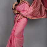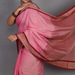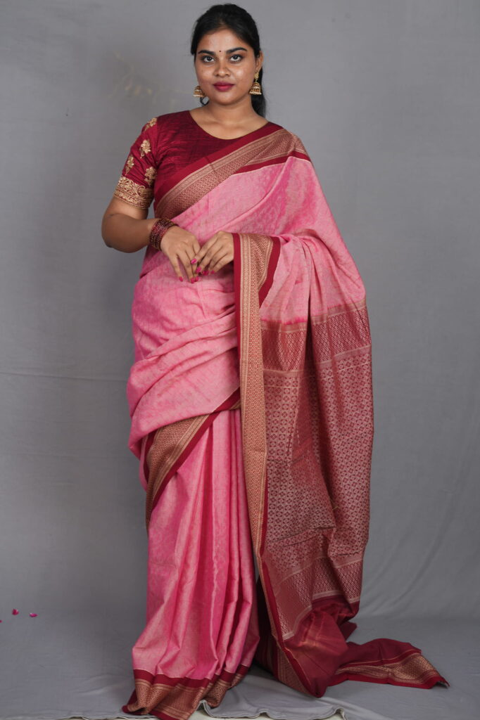 The Palette: A Monochromatic Power Play The Chitraangi Ranjani celebrates a graceful “Pink-on-Pink” transition. The body is rendered in a delicate Rose Pink, possessing a soft, heathered texture that feels organic and light. This feminine base is grounded by a deep Maroon-Wine border and pallu with rich copper-gold undertones. This sophisticated color gradient offers a look that is both gentle and authoritative—perfect for the modern woman in leadership.