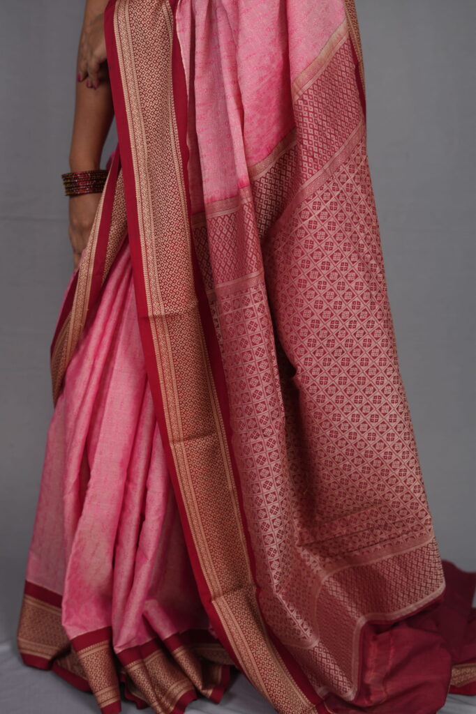The Border: Ancient Kadiyal Artistry The hallmark of this piece is the traditional Kadiyal weave. This ancient technique involves a distinct color-blocking method that creates a sharp, clean contrast between the rose body and the wine border. The border is further elevated with intricate antique gold zari, featuring a mix of traditional geometric and floral motifs that provide a “burnished” glow rather than a bright shine.