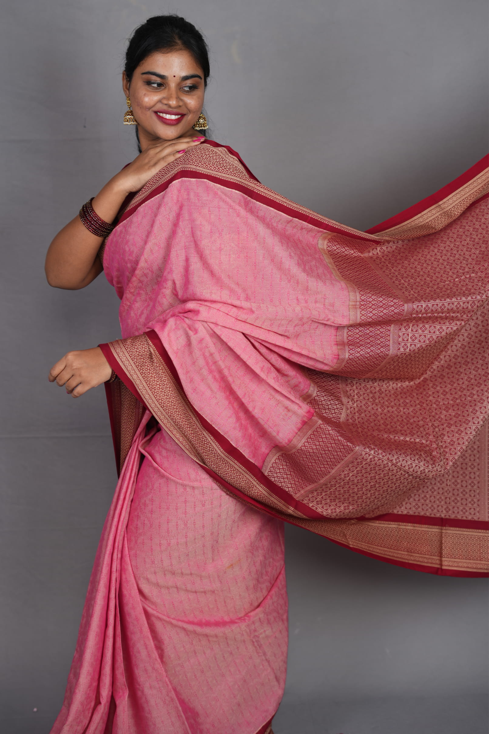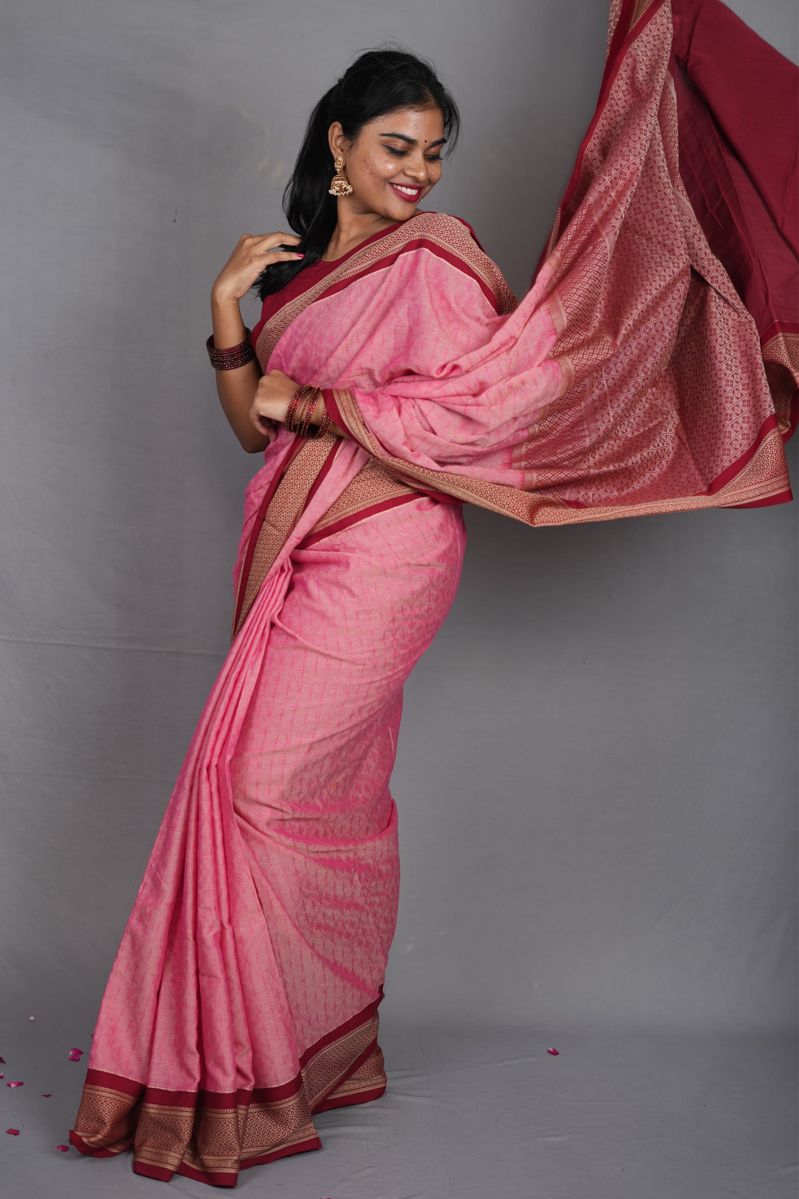 The Border: Ancient Kadiyal Artistry The hallmark of this piece is the traditional Kadiyal weave. This ancient technique involves a distinct color-blocking method that creates a sharp, clean contrast between the rose body and the wine border. The border is further elevated with intricate antique gold zari, featuring a mix of traditional geometric and floral motifs that provide a “burnished” glow rather than a bright shine.