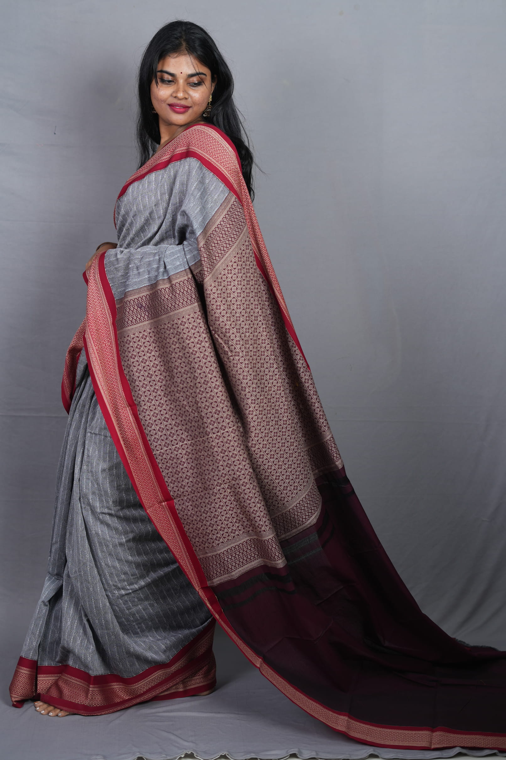 Pair this Grey & Wine masterpiece with silver or oxidised jewelry to complement the cool tones of the body. A crisp, collared wine-colored blouse and a sleek low bun will create a powerful “Boardroom-to-Dinner” look that radiates confidence and grace.