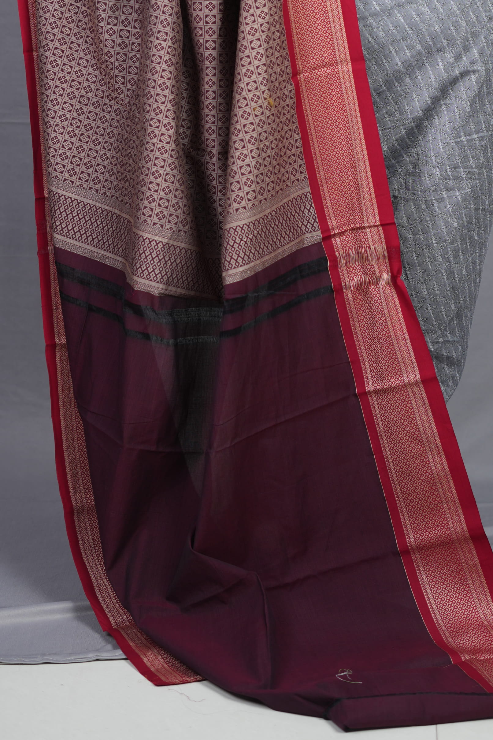 The Border: Ancient Kadiyal Precision The standout feature is the traditional Kadiyal weave, an ancient technique used to create a solid, sharp color-block between the grey body and the wine border. This border is adorned with intricate antique gold zari, featuring geometric patterns and traditional floral motifs that provide a subtle, “burnished” metallic glow.