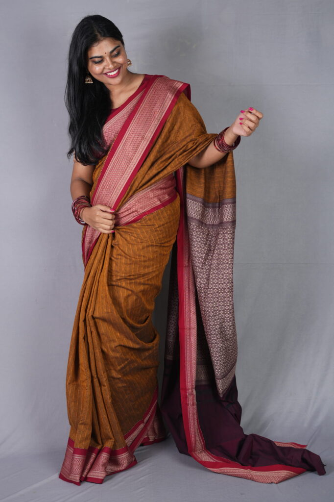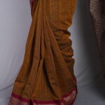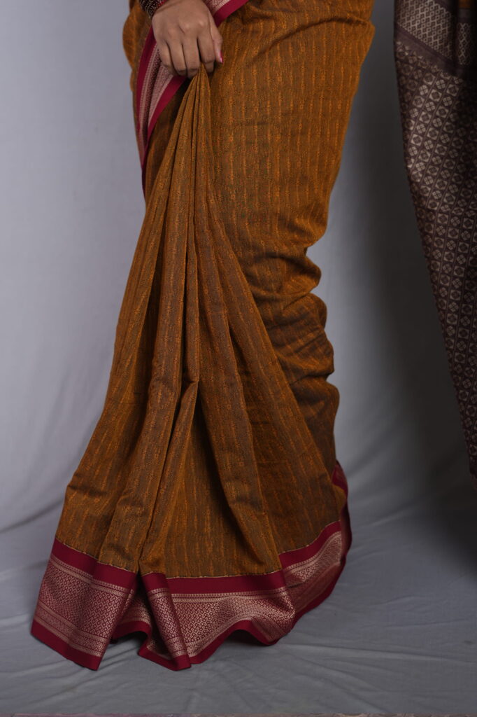 The Border: Traditional Kadiyal Precision The standout feature is the authentic Kadiyal weave, an ancient handloom technique used to join the yellow body and wine border with a sharp, seamless line. The border is adorned with intricate antique gold zari, featuring geometric and floral motifs that provide a muted, “burnished” metallic glow rather than a bright shine.