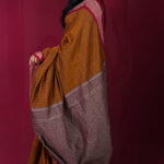 The Pallu: A Dignified Festive Statement The heavy wine-colored pallu adds a layer of grand artistry to the minimalist body. Filled with dense zari-woven patterns and traditional “Jamdani-style” floral accents, it provides a textured, regal drape. The weight of the zari ensures the pallu falls with dignity, making it as suitable for a formal presentation as it is for a celebratory dinner.
