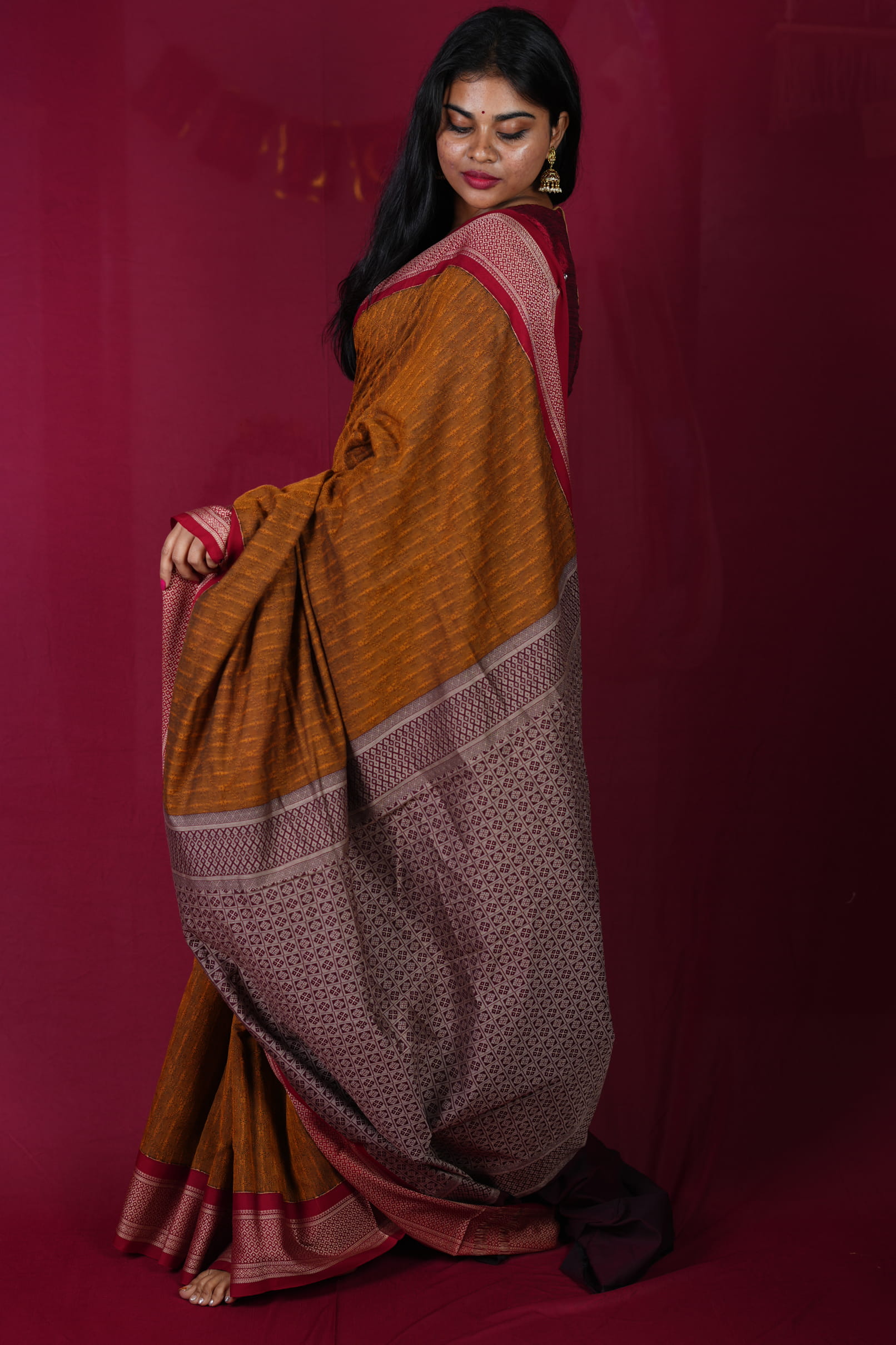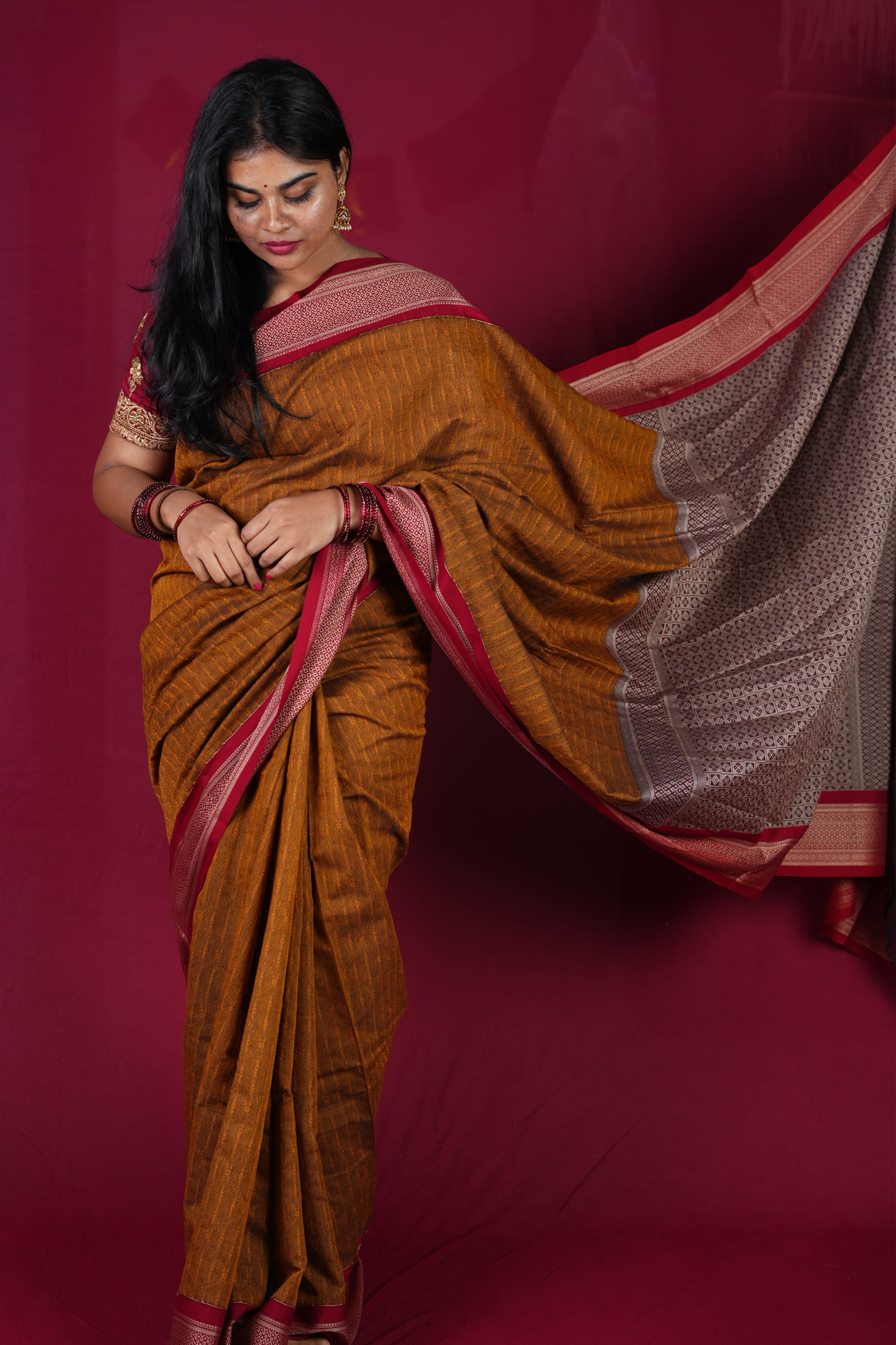 The Rustic Yellow and Wine combination pairs beautifully with terracotta or antique gold jewelry. A sleek, low bun and a deep maroon bindi will perfectly highlight the traditional Kadiyal accents and the earthy warmth of the yellow cotton.