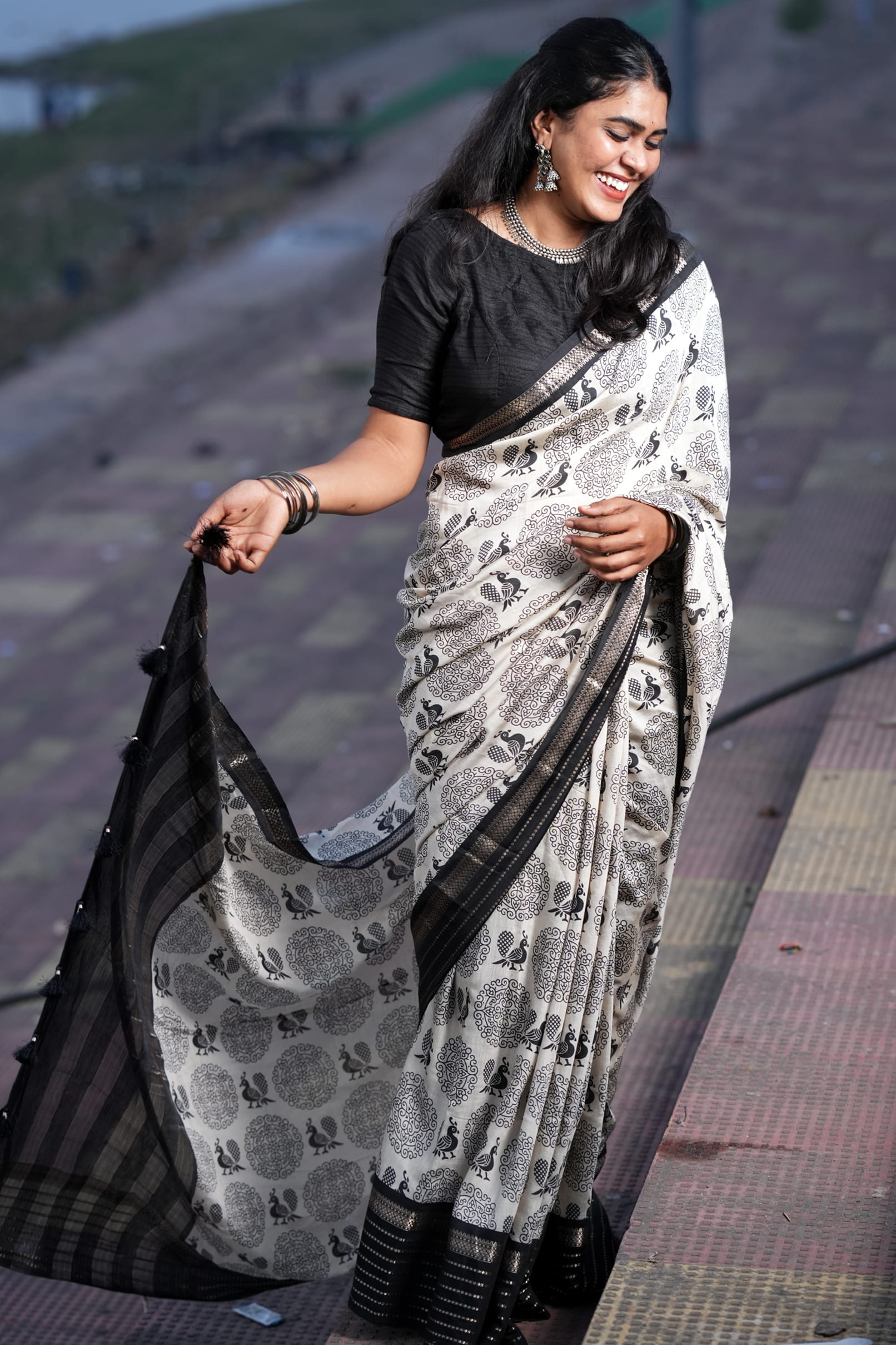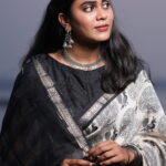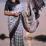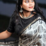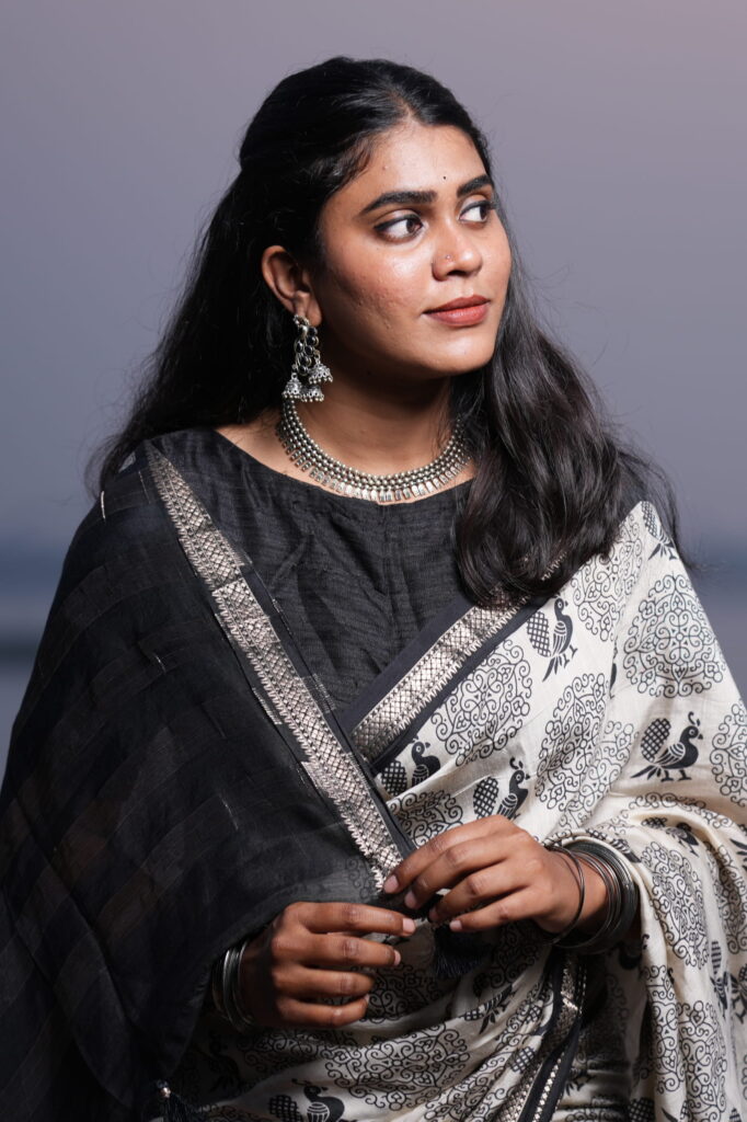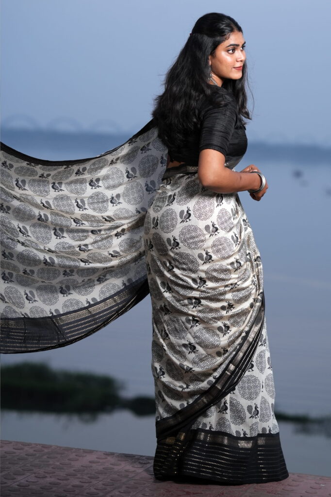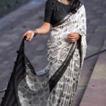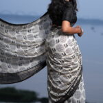 Styling Tip: Pair this saree with silver oxidised jewelry for a bohemian-chic look, or opt for sleek black pearls to lean into its monochrome elegance. A sleeveless black blouse will further highlight the charcoal accents in the print.