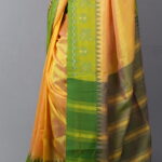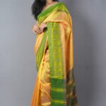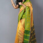 The Palette: An Auspicious Harvest Symphony The Hemalata Vana (The Golden Forest Creeper) is designed around a classic South Indian color story. The body is rendered in a radiant Mustard Yellow, possessing a rich, golden silken glow that symbolizes prosperity. This is dramatically contrasted by a Leaf Green border and pallu, creating a “Harvest” palette that feels energetic, traditional, and deeply rooted in nature.