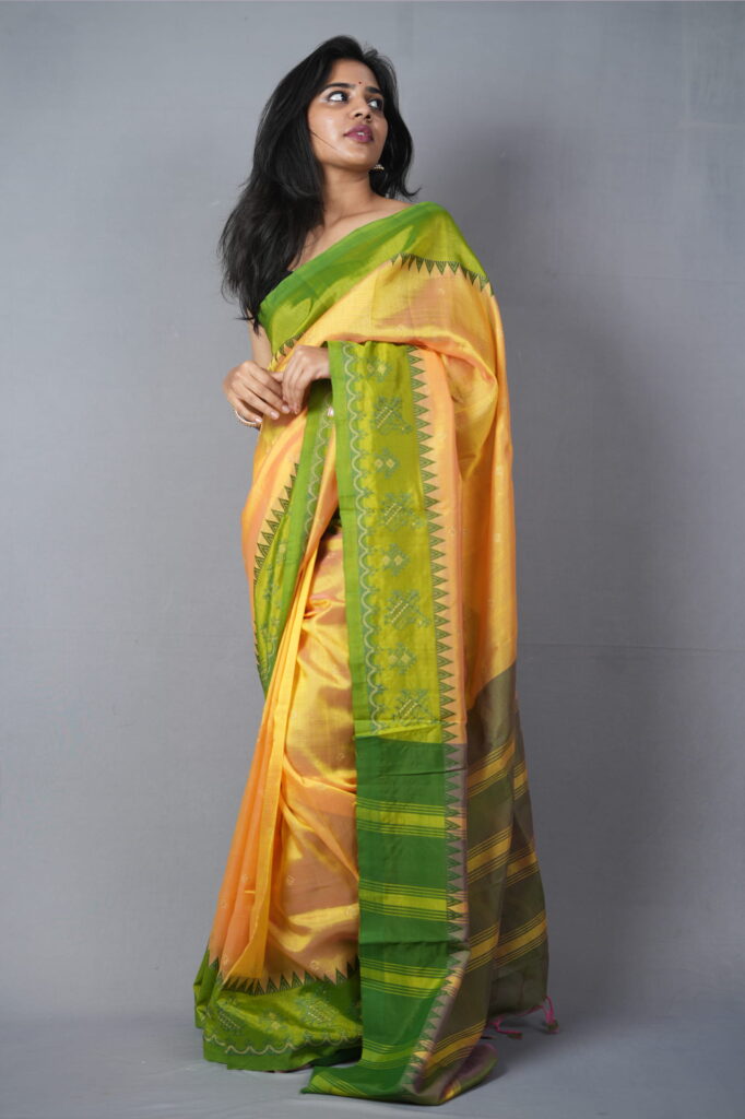 A symphony of festive grace and tradition, the Hemalata Vana is a tribute to the “Golden Creeper” of the forest. This Premium Mangalagiri Silk-Cotton Saree features a radiant Mustard Gold body adorned with dainty gold buttis, framed by a signature Leaf Green Nizam Temple border. With its crisp silhouette and auspicious “Harvest” palette, it is the quintessential choice for religious ceremonies and grand festive mornings.