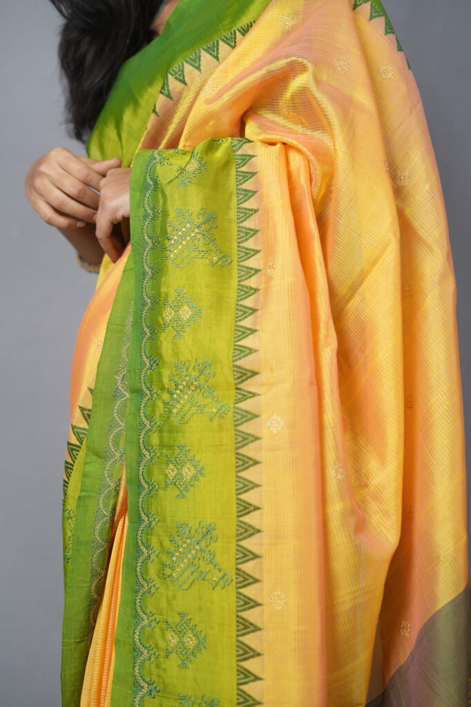 The Hemalata Vana (The Golden Forest Creeper) is designed around a classic South Indian color story. The body is rendered in a radiant Mustard Yellow, possessing a rich, golden silken glow that symbolizes prosperity. This is dramatically contrasted by a Leaf Green border and pallu, creating a “Harvest” palette that feels energetic, traditional, and deeply rooted in nature.