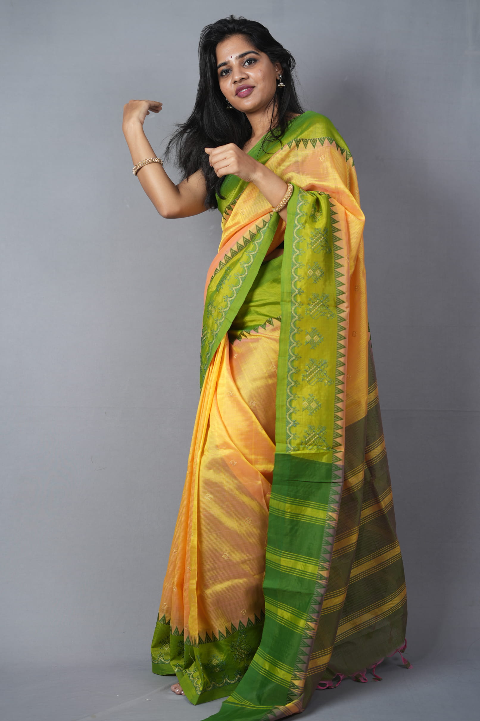 A symphony of festive grace and tradition, the Hemalata Vana is a tribute to the “Golden Creeper” of the forest. This Premium Mangalagiri Silk-Cotton Saree features a radiant Mustard Gold body adorned with dainty gold buttis, framed by a signature Leaf Green Nizam Temple border. With its crisp silhouette and auspicious “Harvest” palette, it is the quintessential choice for religious ceremonies and grand festive mornings.