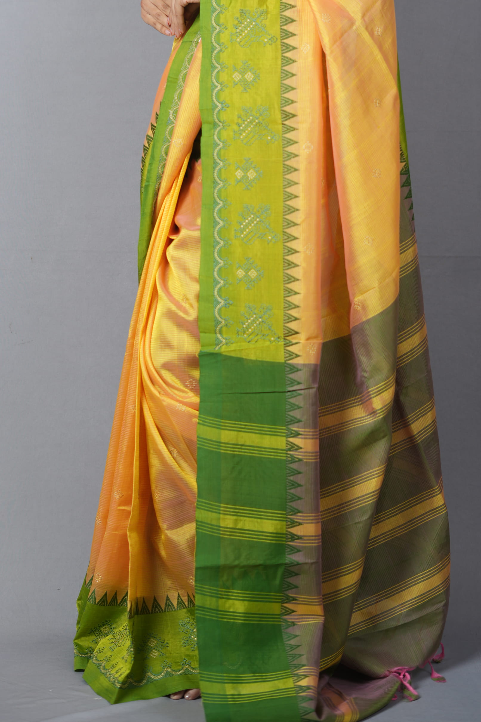 The Hemalata Vana (The Golden Forest Creeper) is designed around a classic South Indian color story. The body is rendered in a radiant Mustard Yellow, possessing a rich, golden silken glow that symbolizes prosperity. This is dramatically contrasted by a Leaf Green border and pallu, creating a “Harvest” palette that feels energetic, traditional, and deeply rooted in nature.