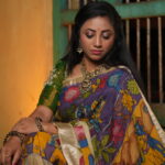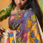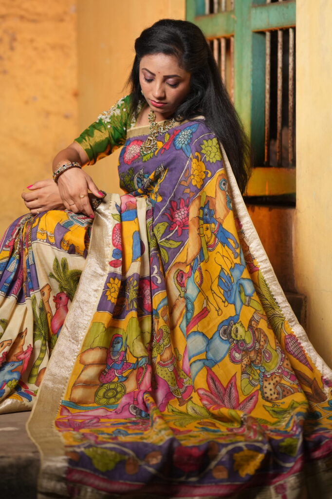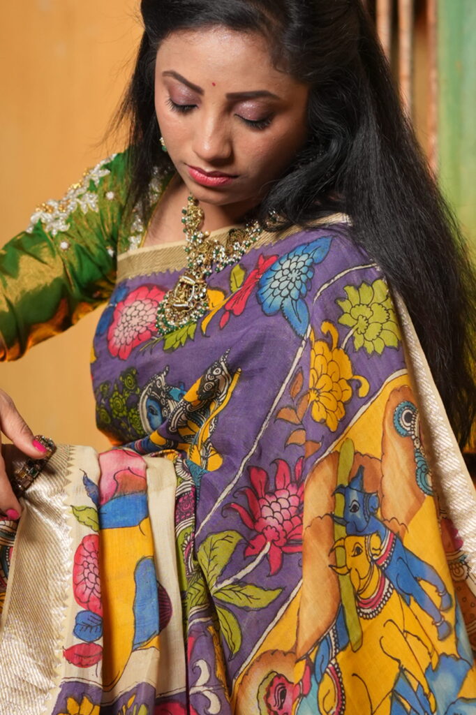 To highlight the “Kala-Vriksha” (Artistic) soul, pair this saree with raw terracotta jewelry or oxidized silver pieces with tribal motifs. A simple, low bun and a small bindi will allow the complex hand-painted narrative of the Pen Kalamkari to remain the undisputed center of attention.