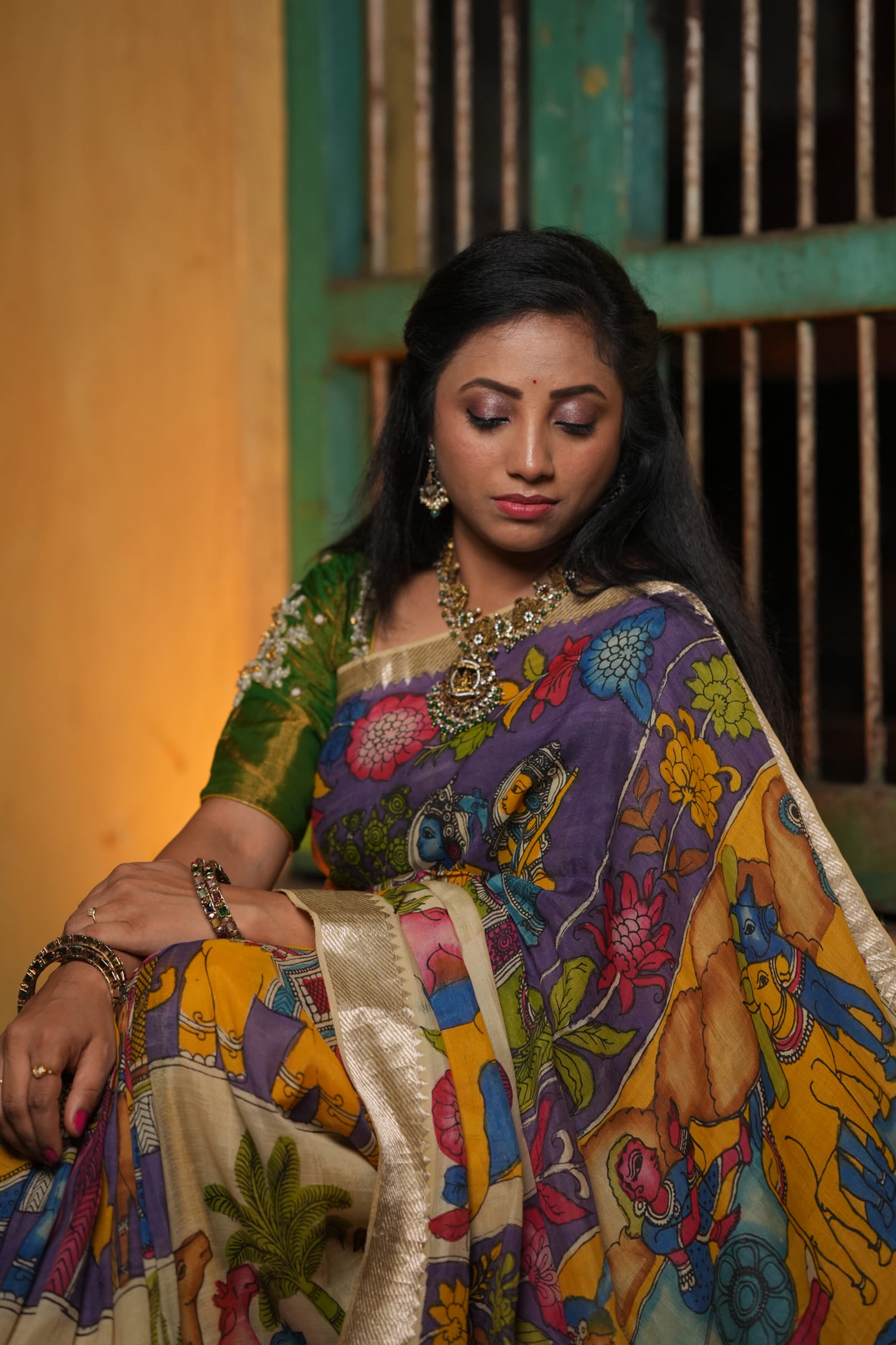 To highlight the “Kala-Vriksha” (Artistic) soul, pair this saree with raw terracotta jewelry or oxidized silver pieces with tribal motifs. A simple, low bun and a small bindi will allow the complex hand-painted narrative of the Pen Kalamkari to remain the undisputed center of attention.
