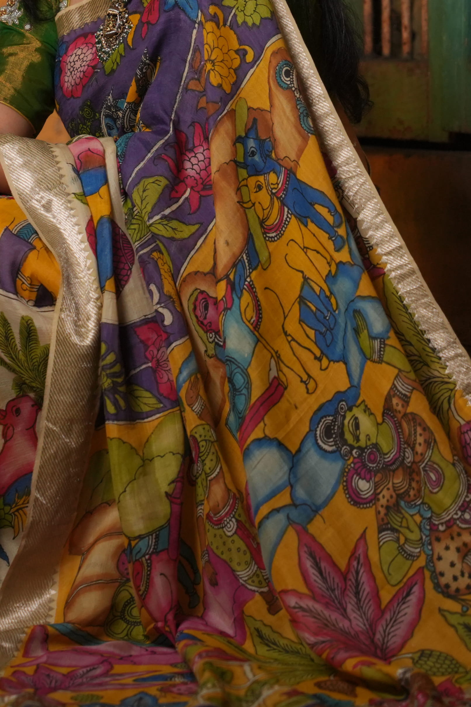 The Body: The Art of the ‘Kalam’ (Pen) The heart of this saree is the authentic Pen Kalamkari technique. Unlike digital or screen prints, every line and curve is hand-drawn by master artisans using a bamboo pen (Kalam). The body features intricate “Tree of Life” (Kalpavriksha) motifs, blooming lotuses, and celestial vines. The natural silk base offers a lustrous, high-grade canvas that absorbs the organic dyes, creating a deep, “painted” texture that is uniquely artisanal.