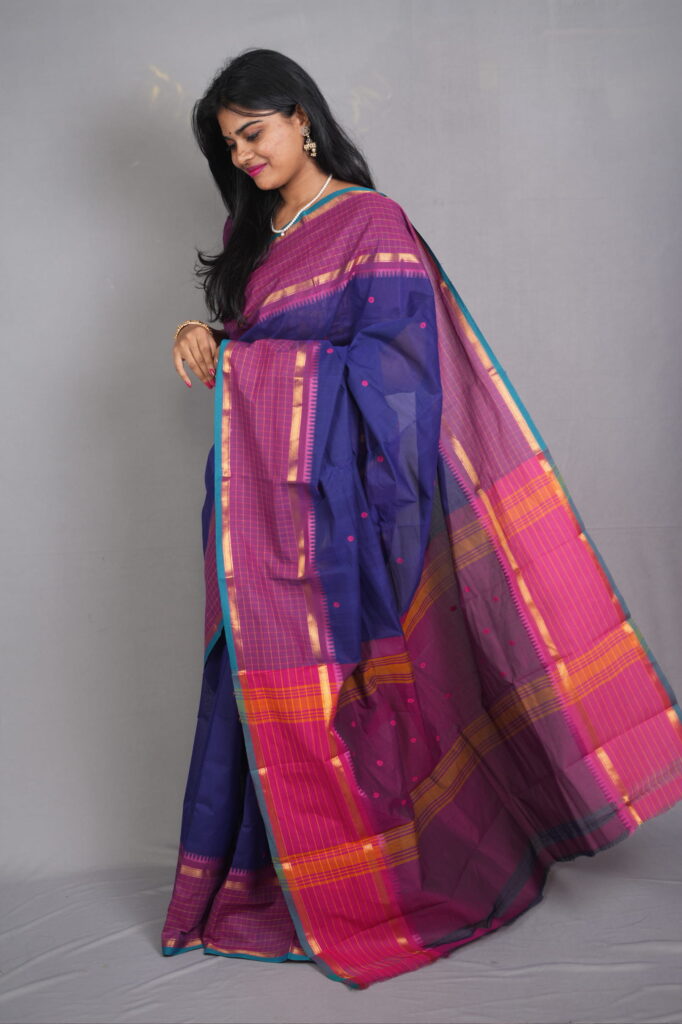 Fabric & Suitability: The Breathable Classic Authentic Kanjivaram Handloom Cotton is prized for being exceptionally skin-friendly and breathable, making it the perfect choice for the Indian climate. The Nilambari Indira is ideal for temple visits, traditional festivals, morning wedding ceremonies, and elegant formal gatherings where heritage is the dress code.