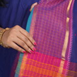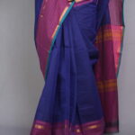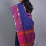 The Palette: A Royal Temple-Town Symphony The Nilambari Indira (The Radiant One Draped in Blue) is a tribute to the timeless aesthetics of South Indian looms. The body is rendered in a deep Ultramarine Blue, providing a rich, commanding presence. This is dramatically anchored by a Magenta and Orange dual-tone border, creating a bold, auspicious palette traditionally seen in the sacred corridors of Kanchipuram.