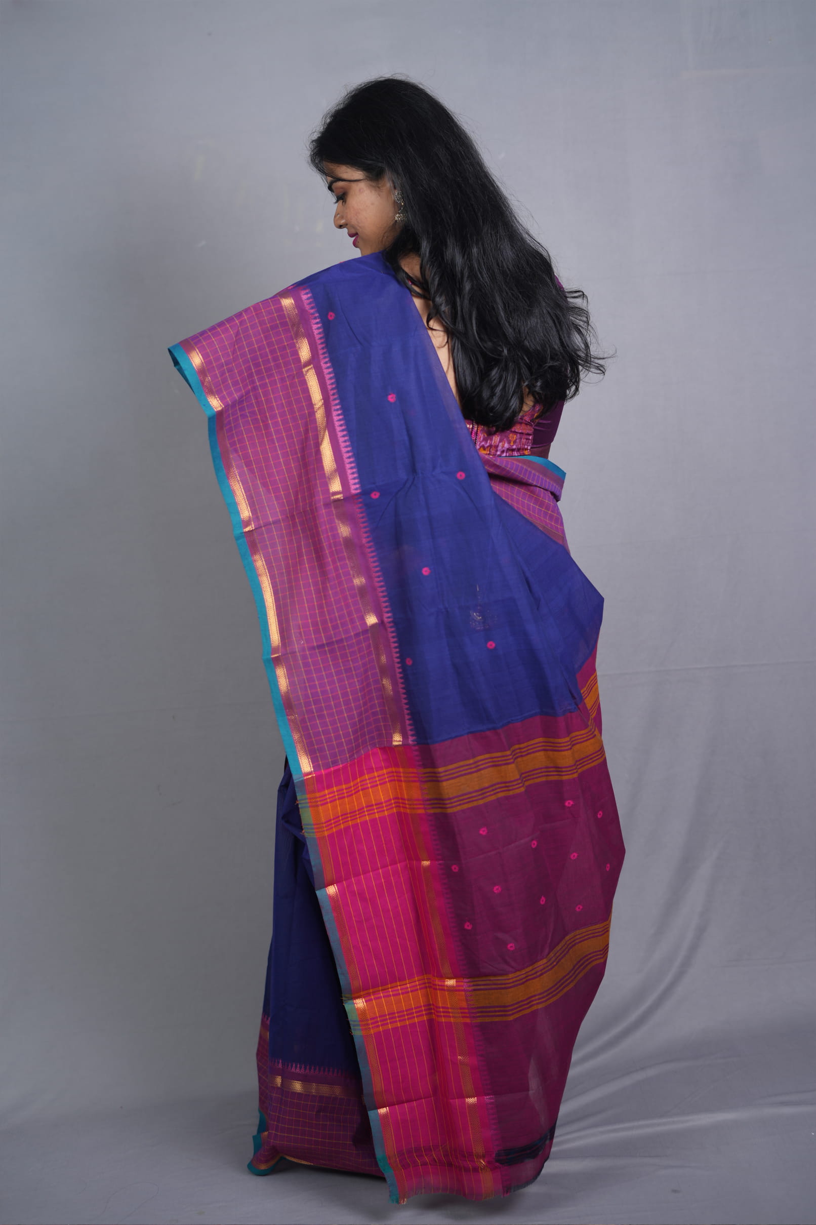 The Palette: A Royal Temple-Town Symphony The Nilambari Indira (The Radiant One Draped in Blue) is a tribute to the timeless aesthetics of South Indian looms. The body is rendered in a deep Ultramarine Blue, providing a rich, commanding presence. This is dramatically anchored by a Magenta and Orange dual-tone border, creating a bold, auspicious palette traditionally seen in the sacred corridors of Kanchipuram.