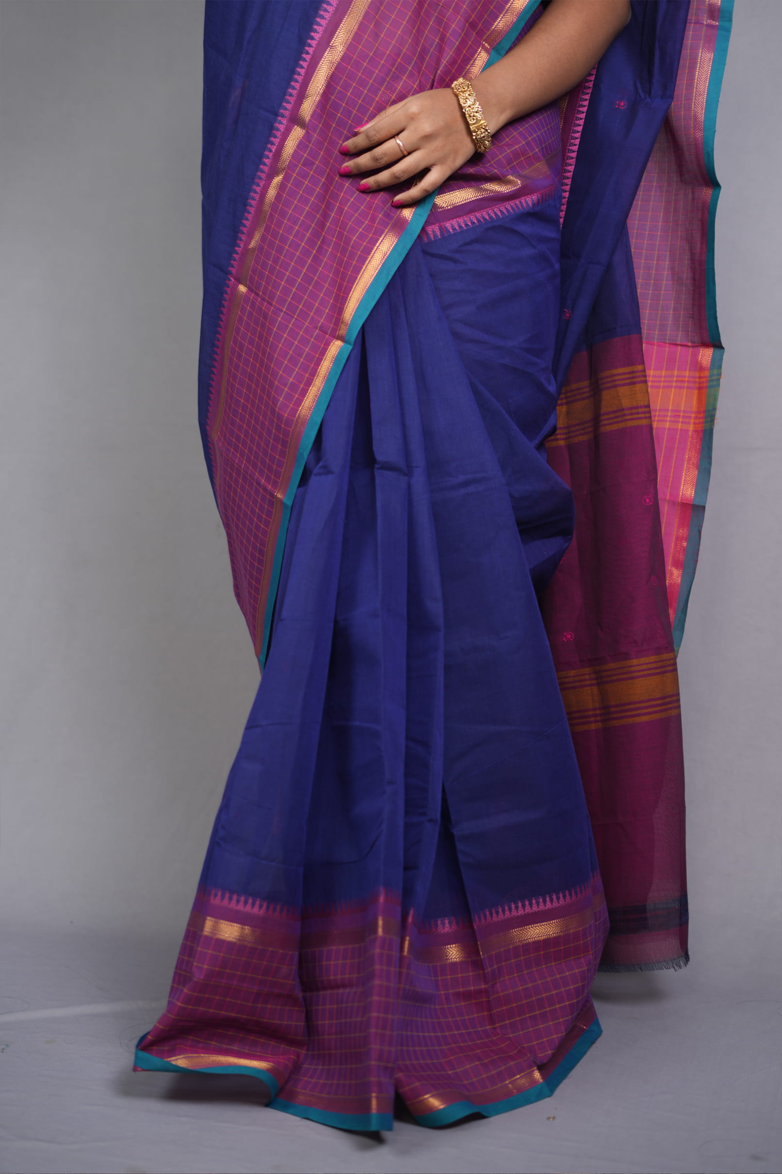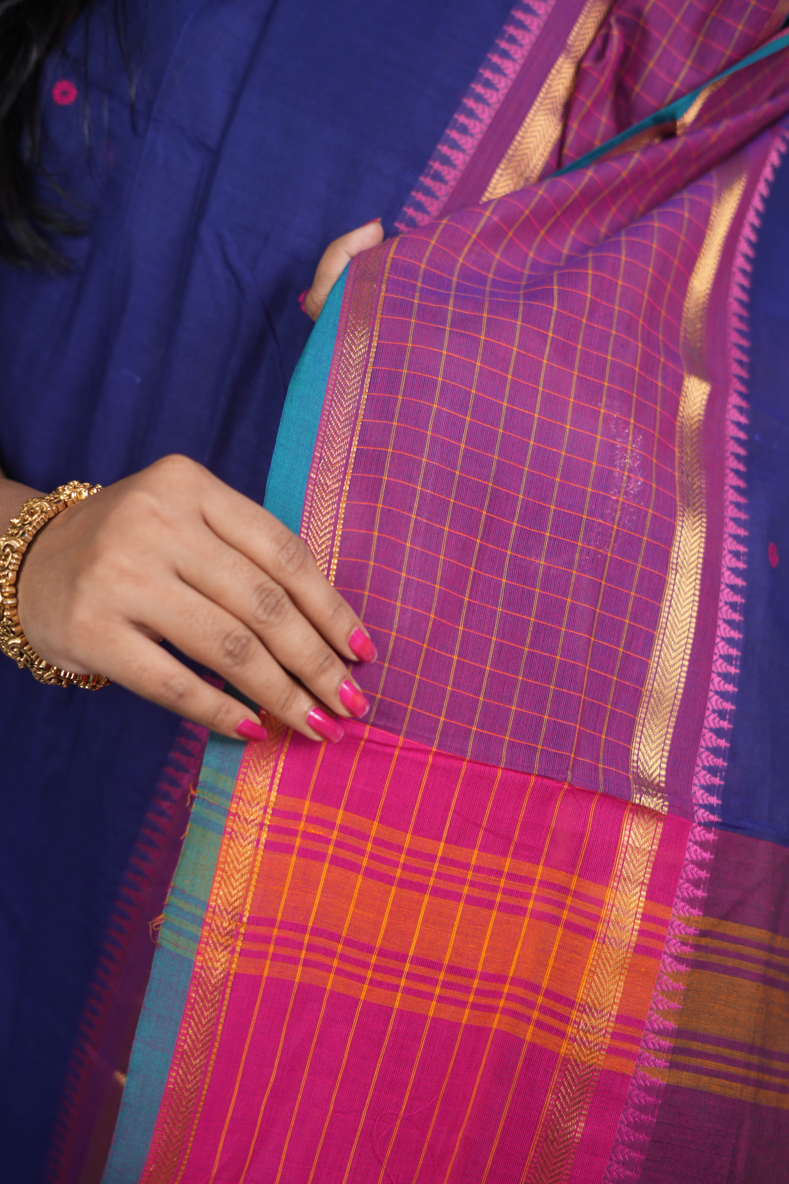 The Body: Hand-Spun Matte Perfection Crafted from premium 100% Hand-Spun Cotton, the body is left solid to highlight the dense, sturdy weave characteristic of authentic Kanjivaram artistry. The smooth, matte finish of the ultramarine canvas is contrasted by delicate multi-colored grid patterns (checks) in the border sections, adding a layer of mathematical precision to its traditional soul.