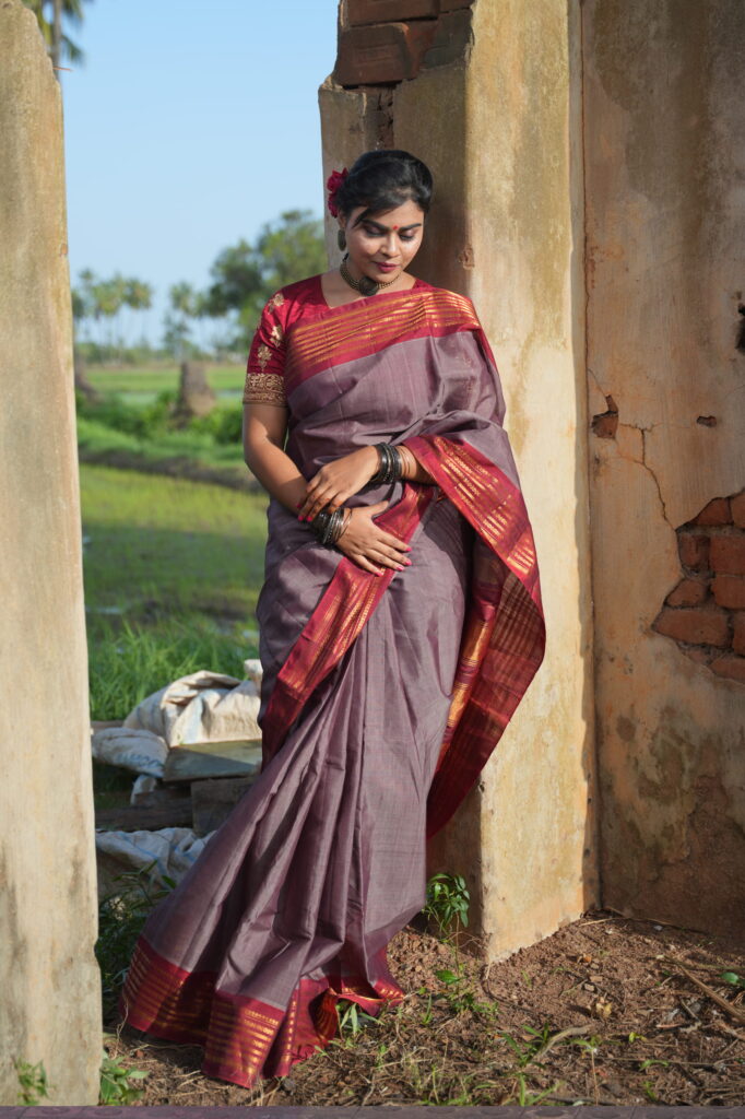 Timeless grace meets the spirit of the earth in the Pallavi Vasudha. This Authentic Gadwal Sico Handloom Saree features a sophisticated Mauve-Taupe body meticulously joined to a deep Maroon Gold Zari border using the traditional Kuttu (interlocking) weave. A vintage-inspired essential for any Chitraangi wardrobe, it is a masterclass in structural elegance and heritage artistry.