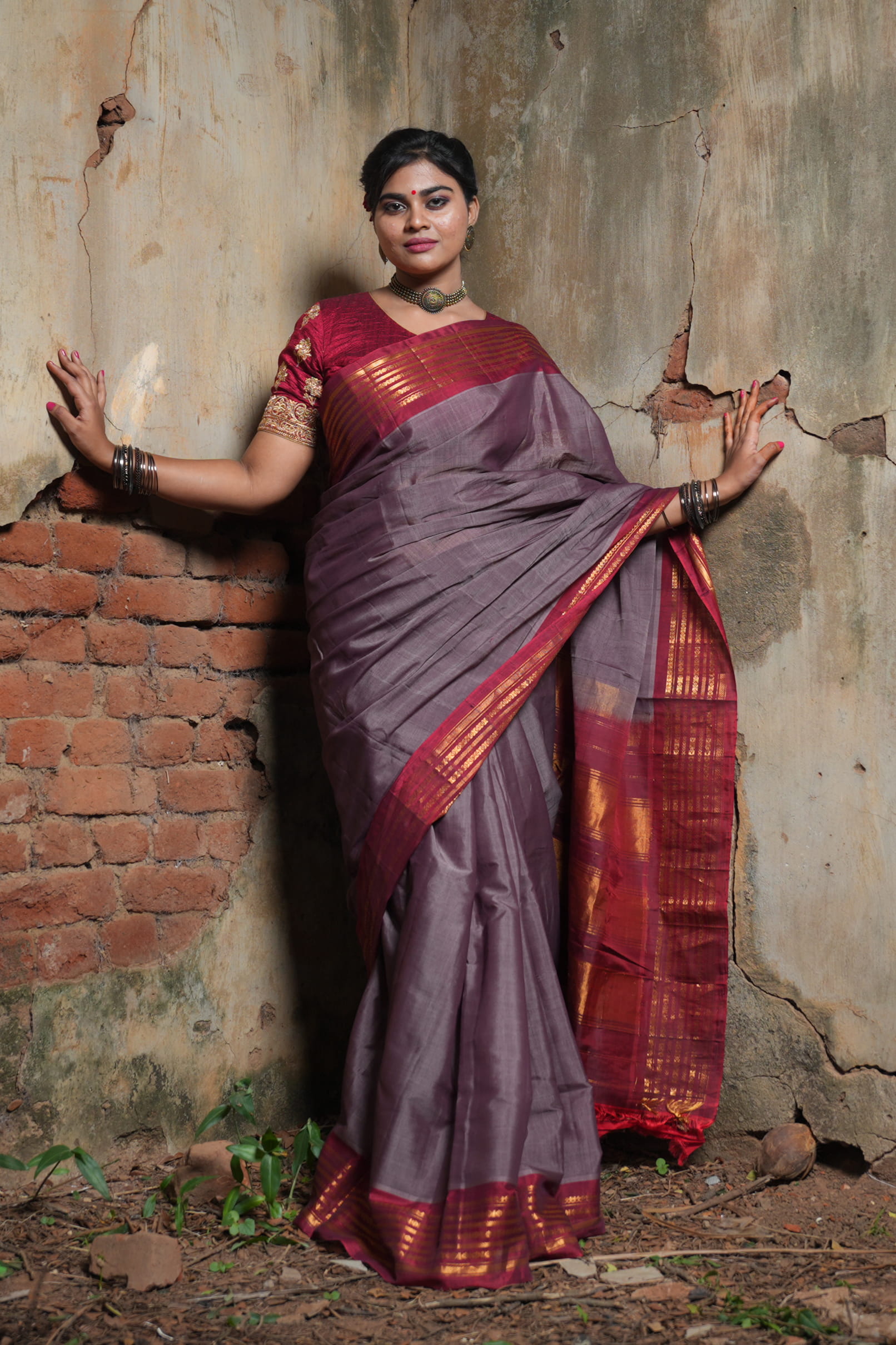 Timeless grace meets the spirit of the earth in the Pallavi Vasudha. This Authentic Gadwal Sico Handloom Saree features a sophisticated Mauve-Taupe body meticulously joined to a deep Maroon Gold Zari border using the traditional Kuttu (interlocking) weave. A vintage-inspired essential for any Chitraangi wardrobe, it is a masterclass in structural elegance and heritage artistry.