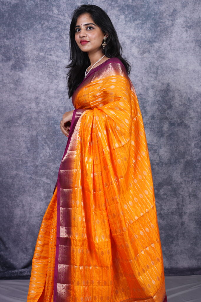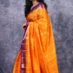 Exquisite Woven Zari Artistry The body of the saree is meticulously adorned with elegant woven zari motifs. These traditional patterns are expertly integrated into the silk weave, adding a layer of shimmering texture that feels as luxurious as it looks. The gold-toned zari work provides a classic, high-end touch, elevating the vibrant orange base into a garment fit for royalty.