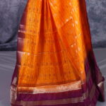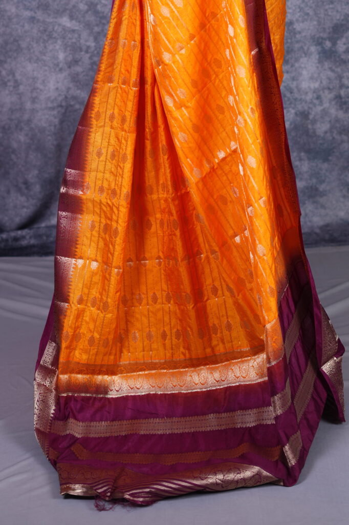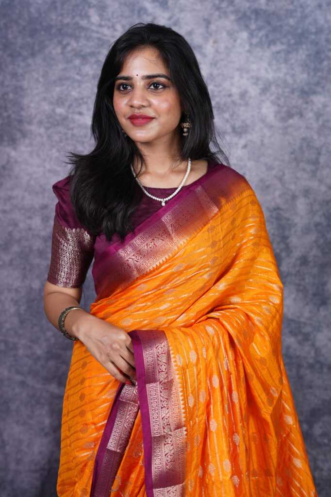 The Glow of Sunset: Turmeric & Orange Hues Capturing the essence of a divine evening sky, the base of this saree is a stunning sunset orange with deep turmeric undertones. This color radiates natural warmth and joy, providing a luminous sheen that catches the light beautifully under both sun-drenched daytime ceremonies and shimmering evening gala lights.