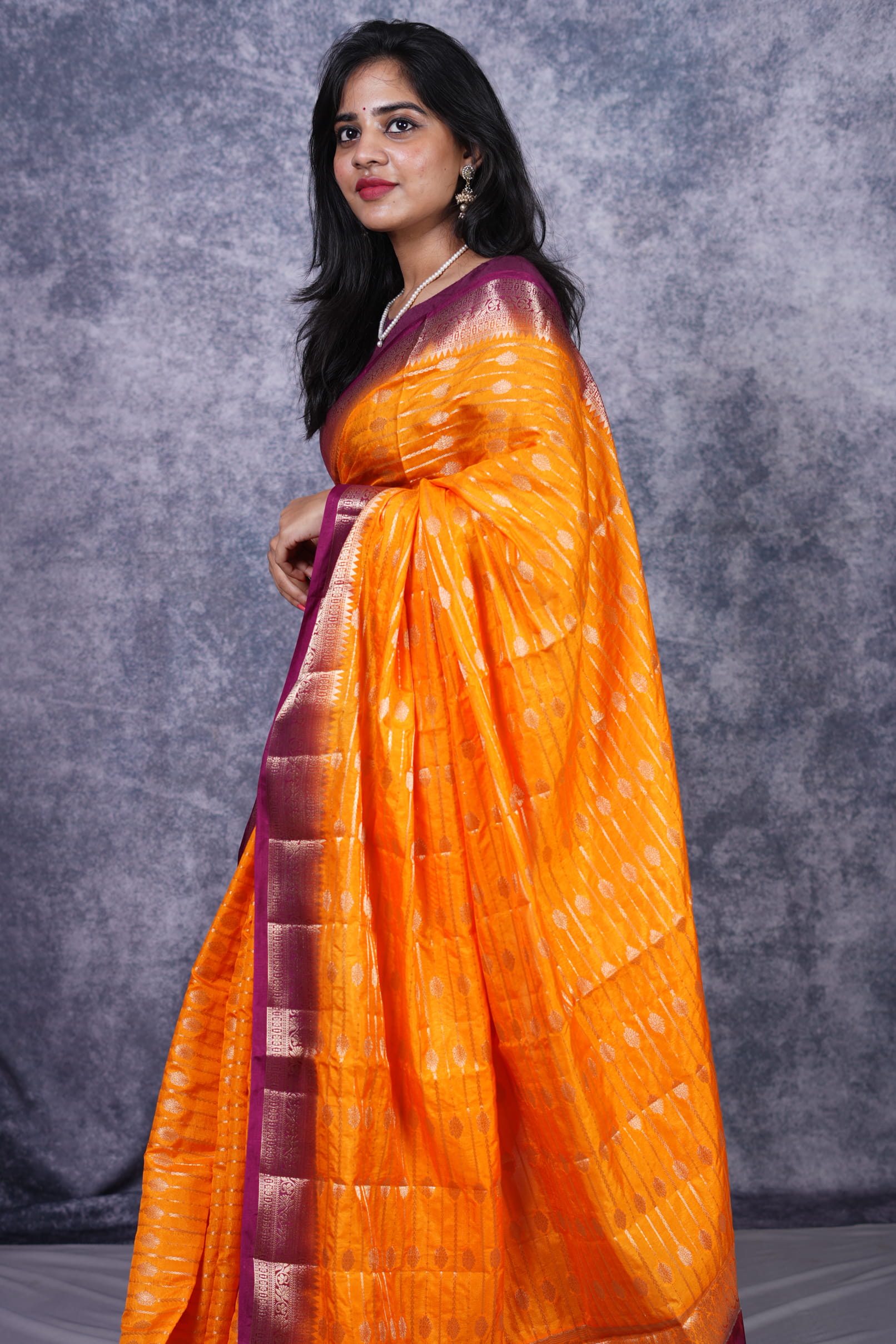 For a traditional look, pair this saree with antique gold jewelry or Kundan sets. A deep wine-colored bindi and a contrast blouse with elbow-length sleeves will highlight the intricate border and bring out the richness of the turmeric hues.