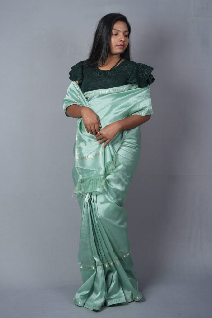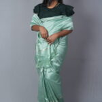 To highlight the “Rajata” (Silver) accents, pair this saree with Silver or White Gold jewelry. A set of silver jhumkas and a sleek, low bun will emphasize the contemporary seafoam tones. For a professional look, choose a high-neck blouse; for a festive daytime event, a sleeveless silver blouse will add a touch of modern glamour.