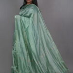 The Palette: A Frost-Inspired Serenity The Rajata Mukhi (The Silver-Faced/Radiant One) is a celebration of cool, calming tones. The body is rendered in a sophisticated Seafoam Green, exhibiting a soft, pearlescent glow that changes subtly under different lighting. This is accented by Crisp Silver Zari, creating a frost-inspired palette that feels modern, refreshing, and effortlessly elegant.