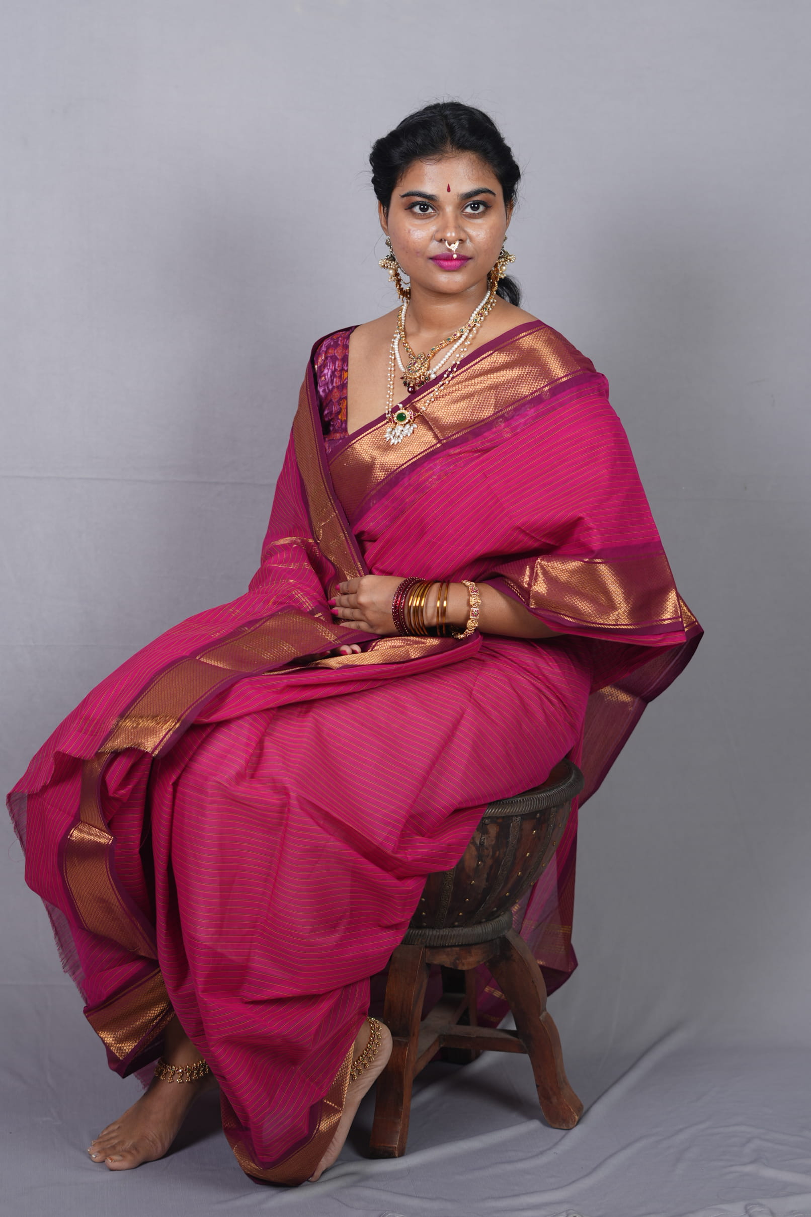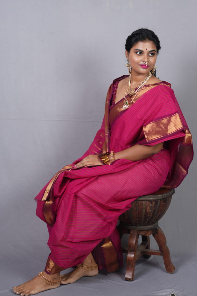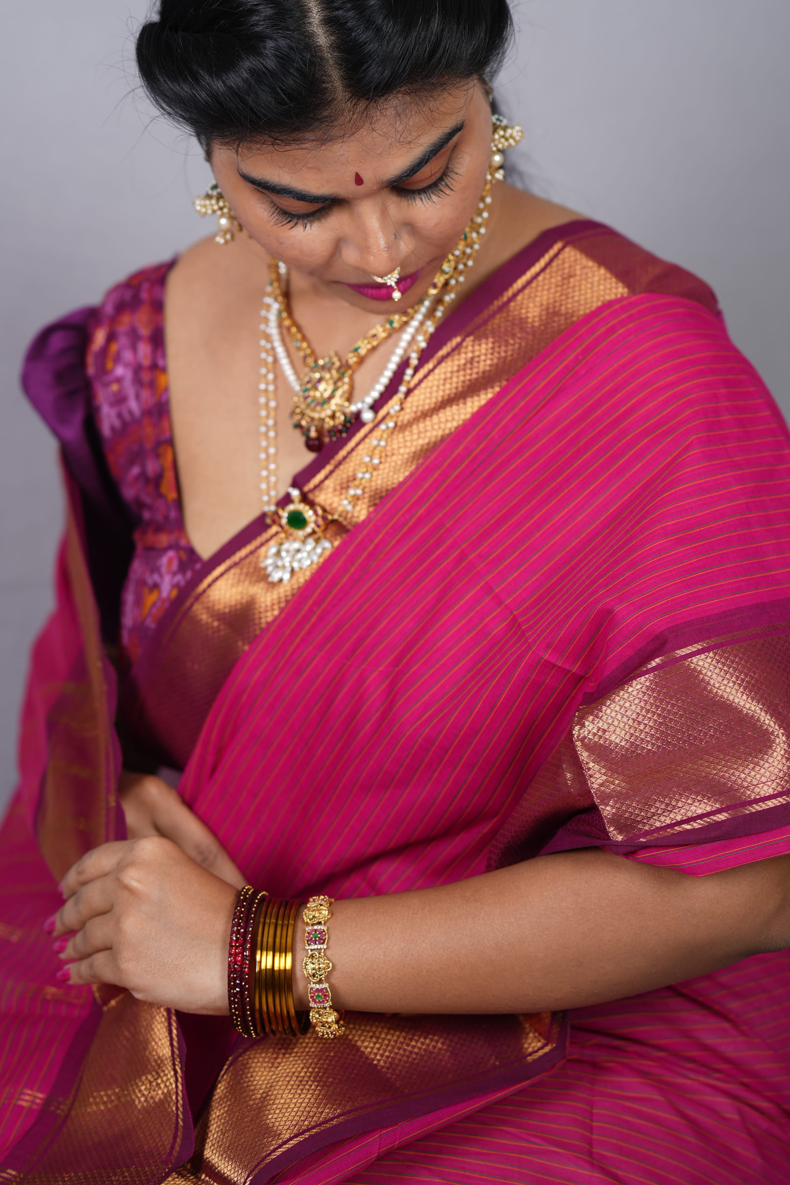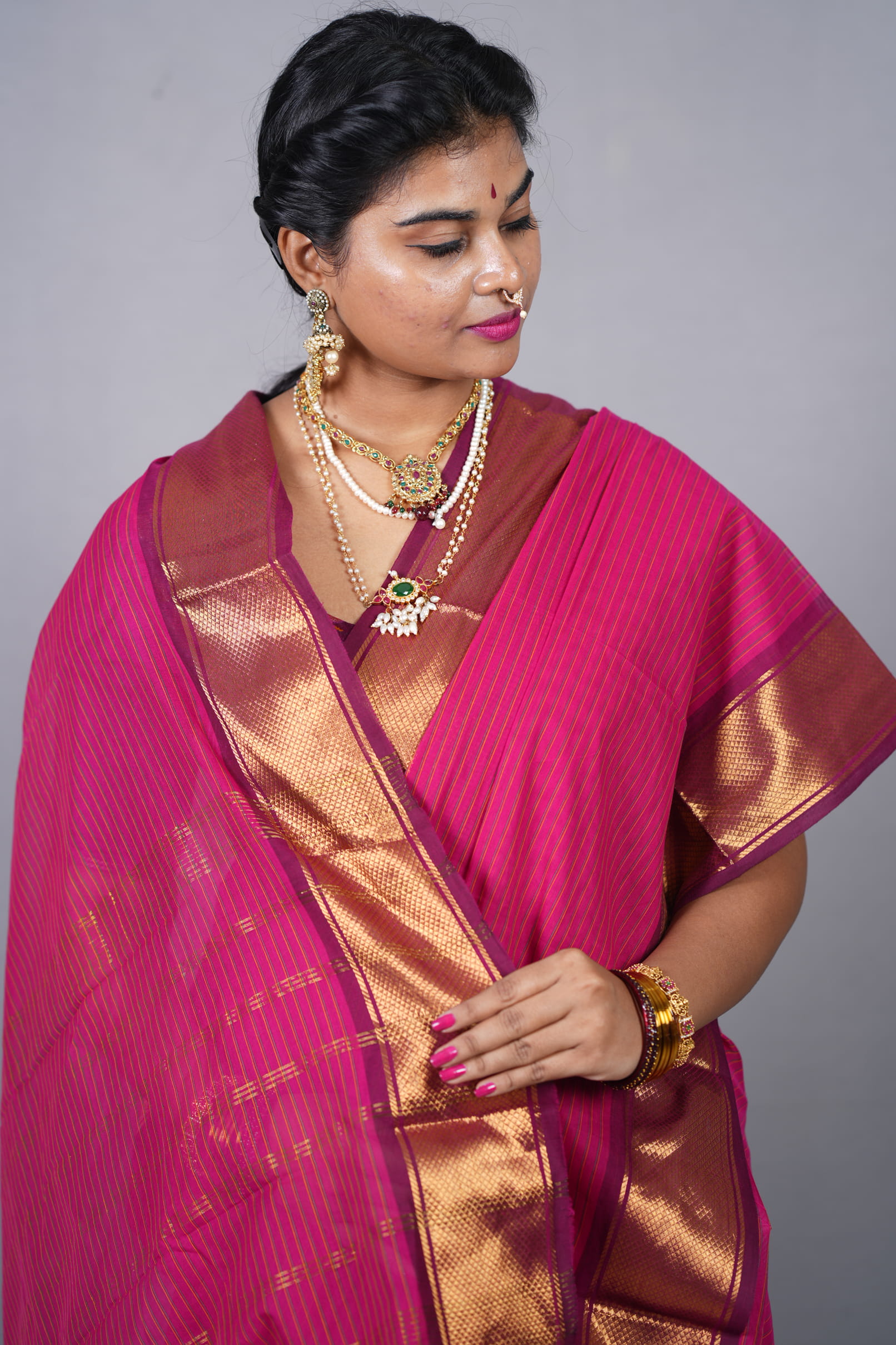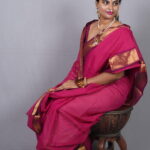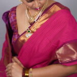 Since the saree has a vibrant pink glow, pair it with matte gold or temple jewelry. A high-neck blouse or a traditional elbow-length sleeve blouse in the same rani pink will emphasize the “Sindura Mangala” look of monochrome elegance.