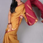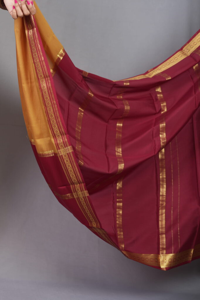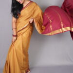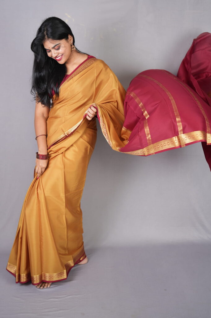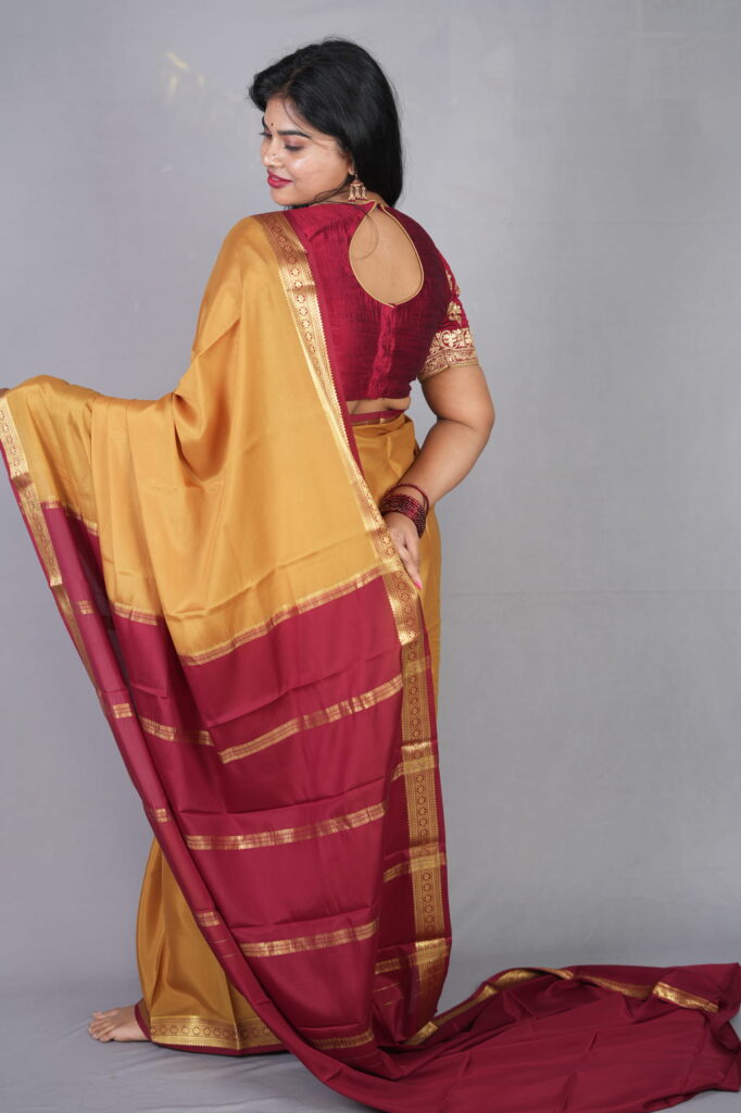 To bring out the honey-tones of the Swarna Mukhi, pair it with antique gold temple jewelry or long mango-mala necklaces. A traditional round bindi and a silk blouse in the contrast maroon shade will complete this quintessential “South Indian Royalty” look.