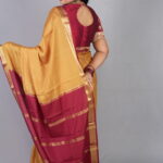 The Palette: Earth, Wine, and Burnished Gold The Swarna Mukhi captures the essence of a sun-drenched heritage. The body is rendered in a deep, burnished Mustard Gold, offering a rich honey-toned luster that feels both grounded and opulent. This warm, earthy base is dramatically contrasted by a Classic Maroon-Wine border and pallu, a color combination that has defined South Indian festive royalty for generations.