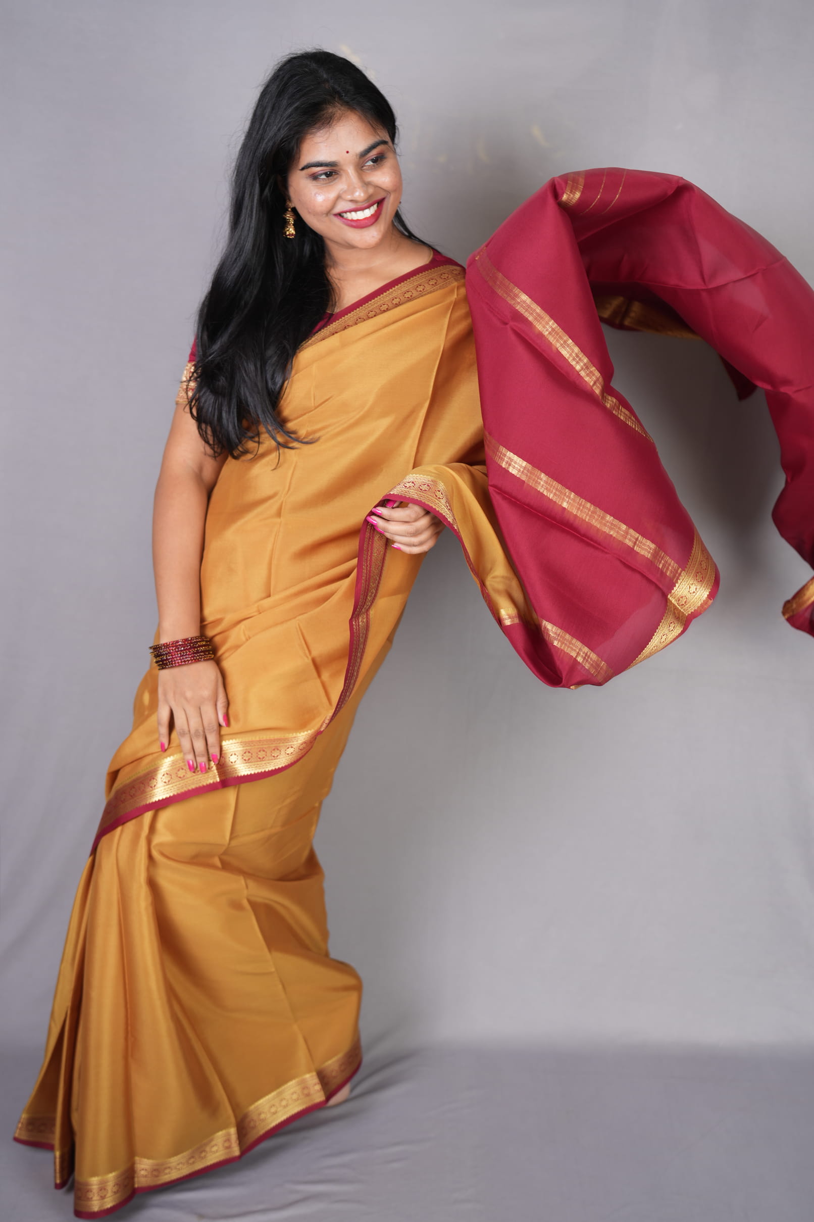To bring out the honey-tones of the Swarna Mukhi, pair it with antique gold temple jewelry or long mango-mala necklaces. A traditional round bindi and a silk blouse in the contrast maroon shade will complete this quintessential “South Indian Royalty” look.