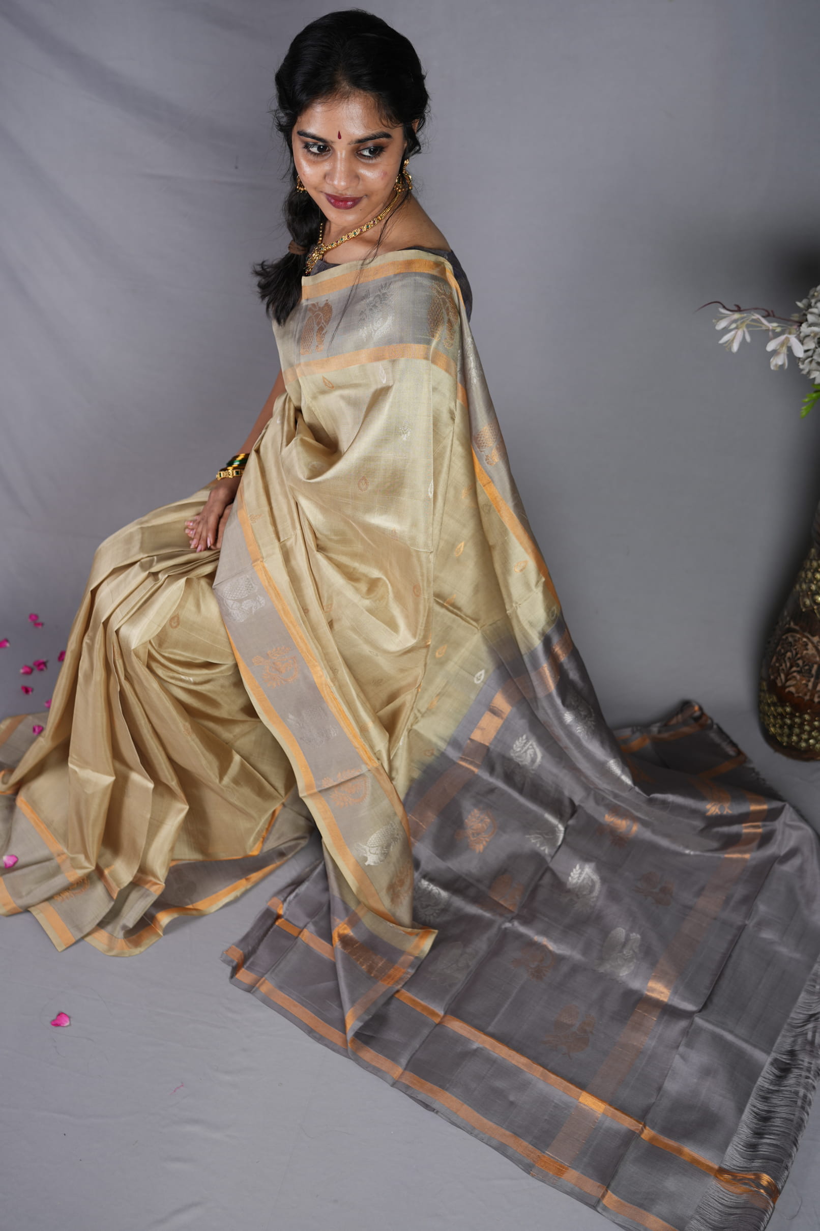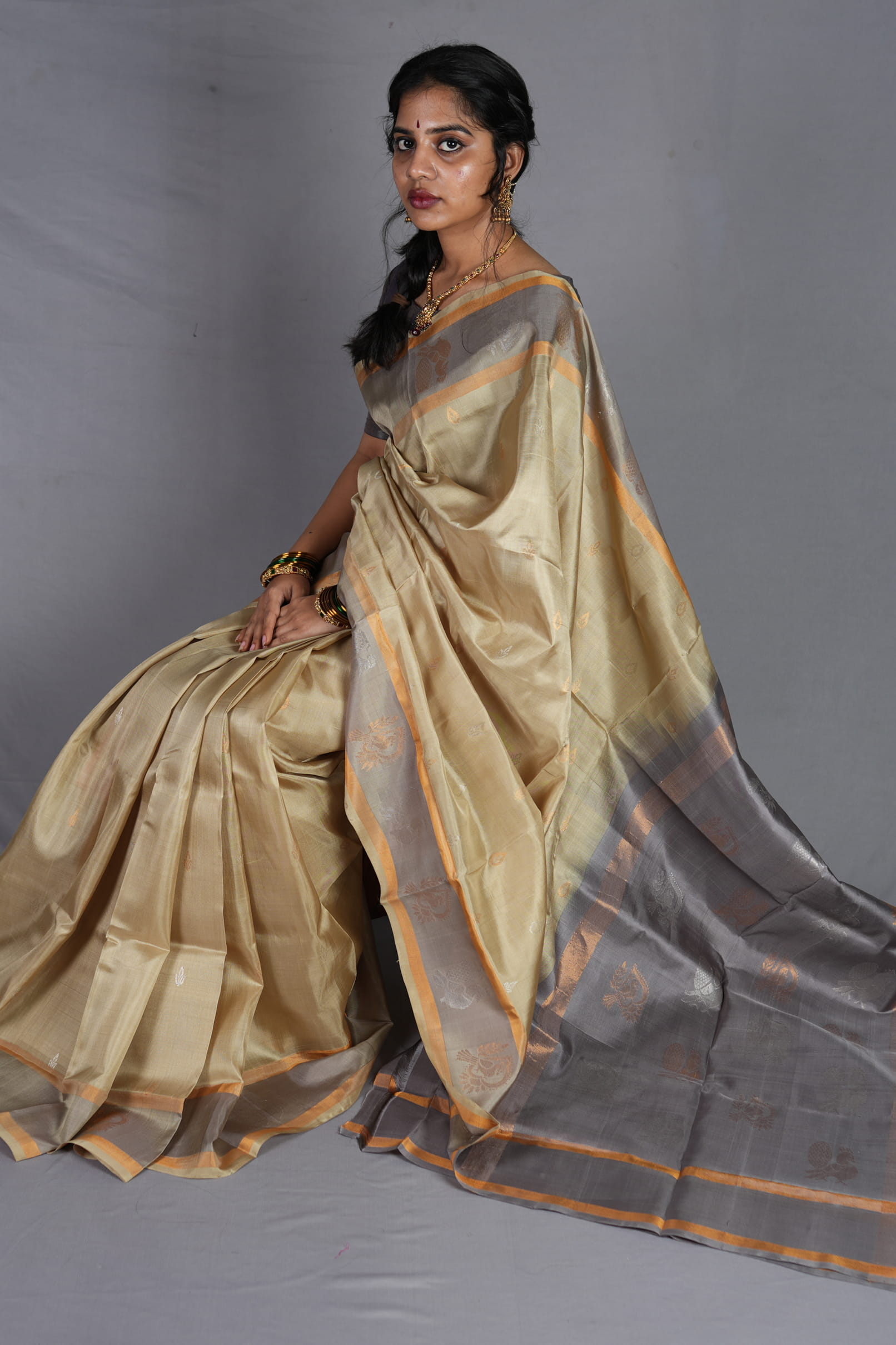 The Contrast: Ash-Grey & Antique Gold Breaking away from traditional bright contrasts, the Swarna Valli embraces a refined dual-tone palette. The body is framed by a medium-width border in a muted silver-grey, finished with a delicate antique gold selvedge. This leads into a magnificent ash-grey pallu, where horizontal zari bands and traditional woven motifs add layers of depth and royal character without adding any physical bulk.