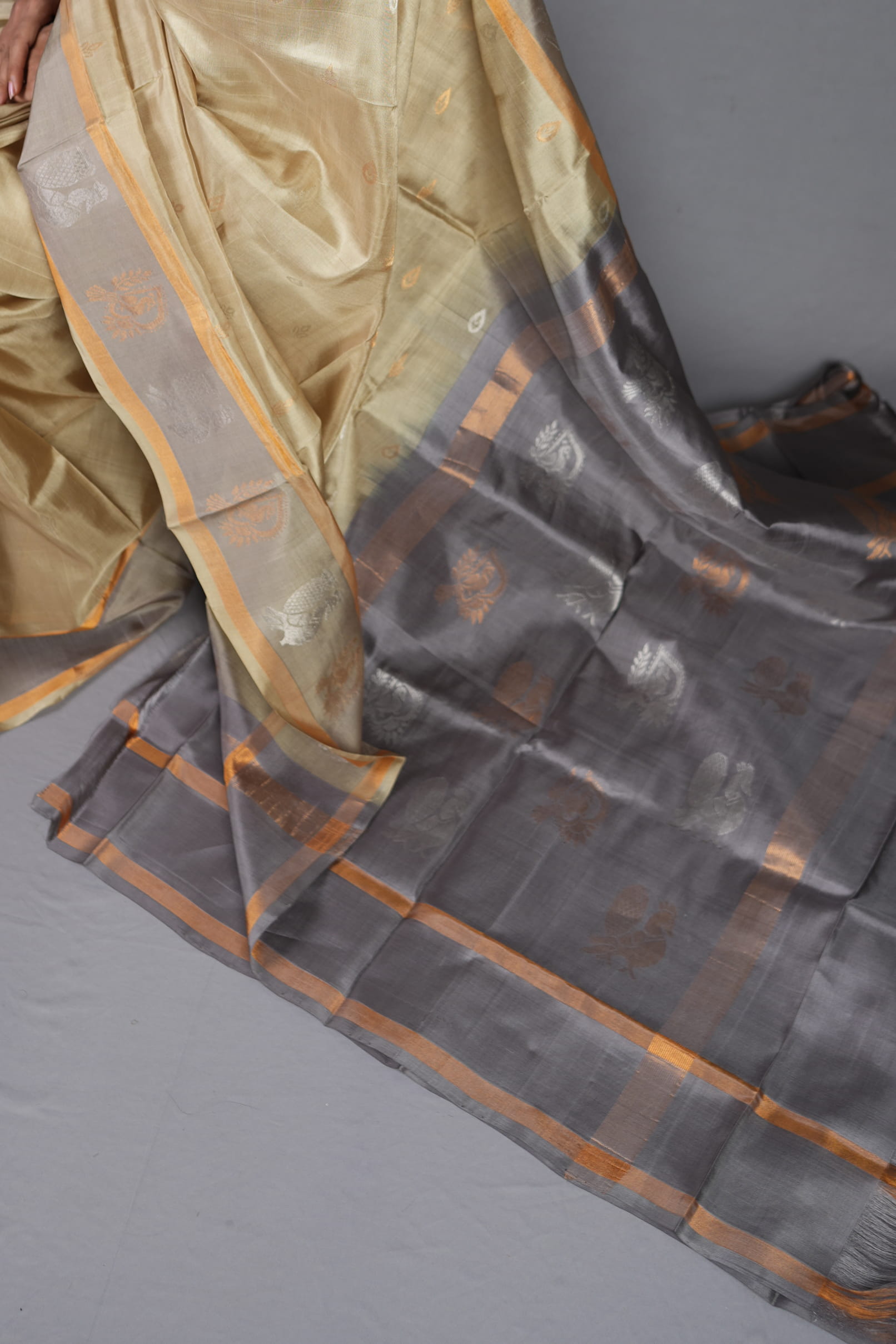 Pallu Detail: Elegant Ash-Grey with Horizontal Zari Bands & Traditional Motifs