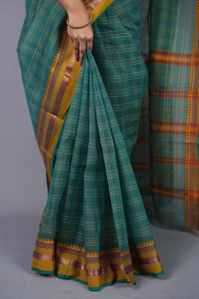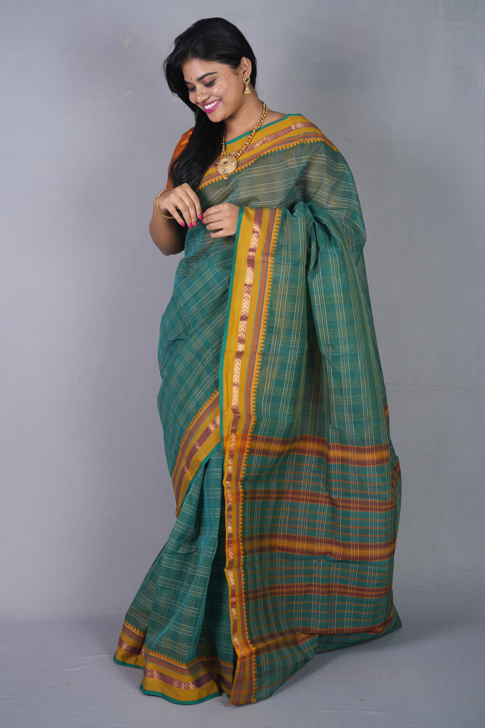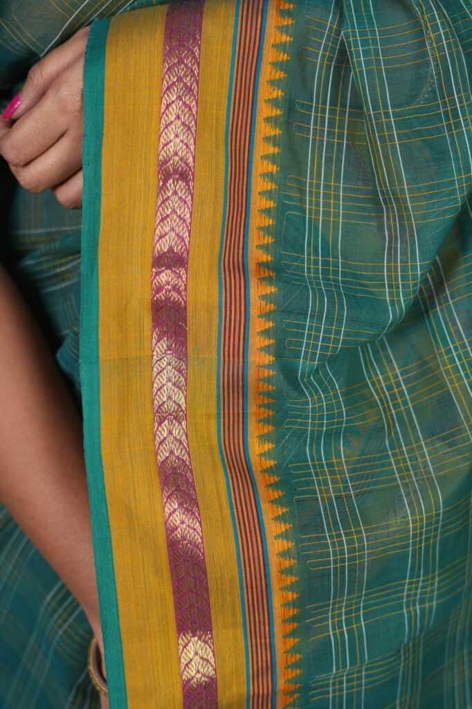 The Border: The Signature Narayanpet Temple The hallmark of this saree is its Traditional Narayanpet Border. A wide, vibrant mustard-yellow base is embellished with the iconic triangular “Temple” (Gopuram) motifs in rust-red along the inner edge. Thin, elegant lines of gold zari are woven into the border, adding a whisper of festive shimmer to the otherwise grounded, earthy aesthetic.