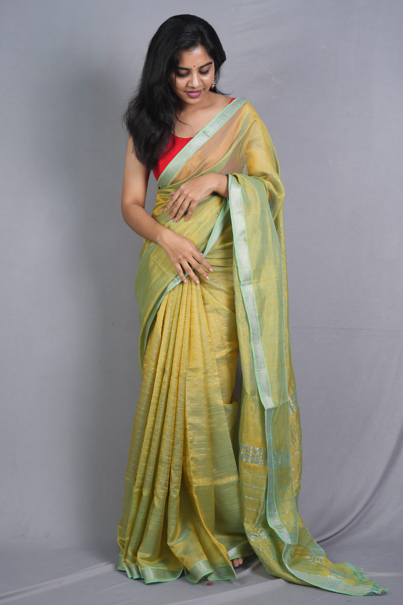 The Body: Iridescent Silken Luster Woven from a premium Sico (Silk-Cotton) blend, the body exhibits a shifting luster as the yellow and green threads catch the light. The design is kept minimalist to showcase the depth of the color and the signature subtle horizontal ribbing characteristic of authentic Mangalagiri handlooms. The fabric offers a crisp, “air-light” feel that remains breathable throughout the day.
