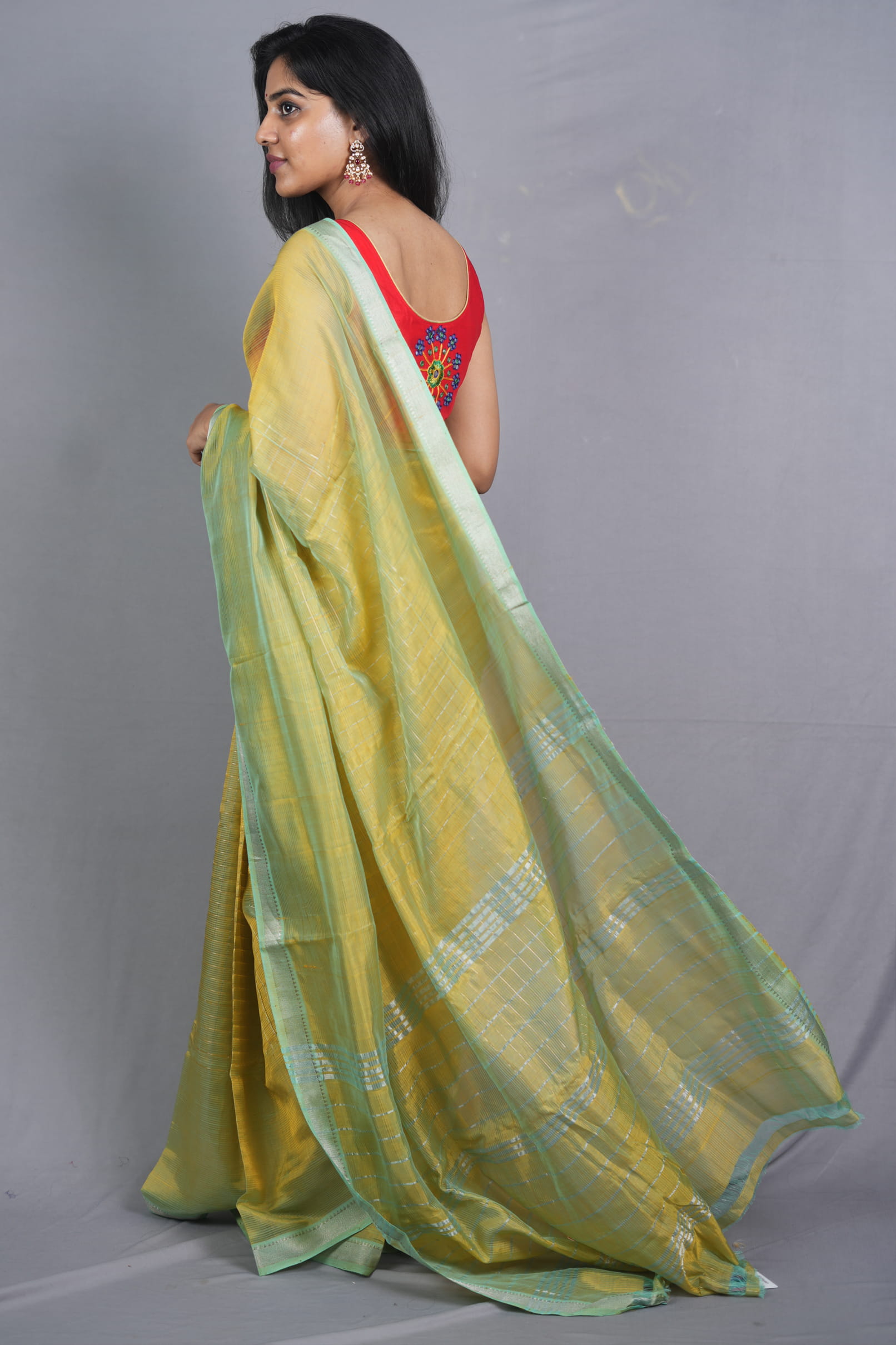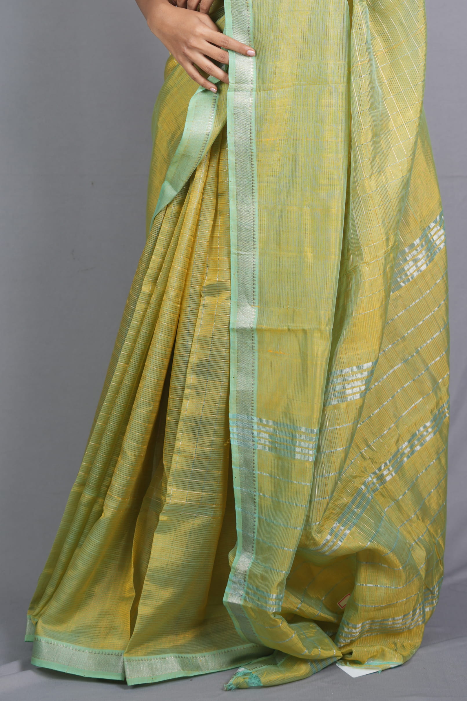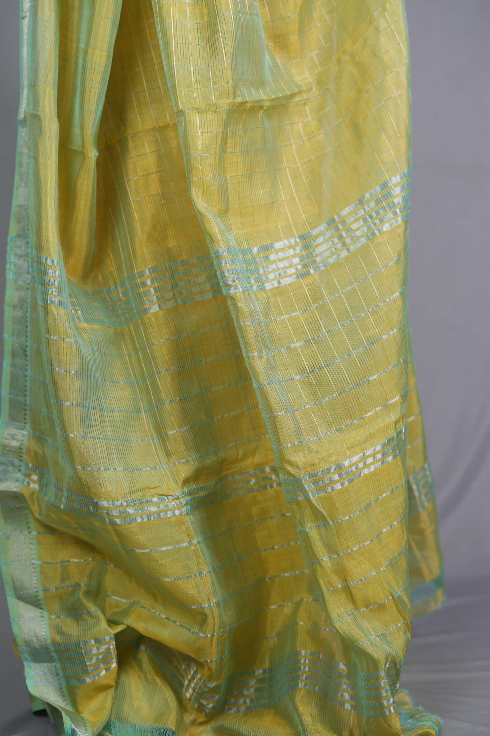 The Palette: A “Spring-Inspired” Chameleon Weave The Vasantini Kanakangi (The Golden-Bodied Bringer of Spring) is a study in color depth. The body is rendered in a vibrant Mango Yellow, woven with green silk threads to create a stunning, dual-tone iridescent effect. This “Chameleon” glow is anchored by a refreshing Seafoam Green border, blending traditional harvest warmth with a cool, contemporary accent.